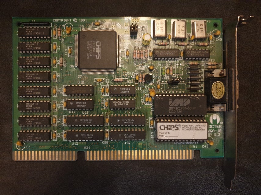 This is another VGA card based on the C&T F82C451C VGA chipset, this time from Octek. Like the Jovian card above, it has eight 100ns DRAMs (OKI M4164) that are soldered in. The RAMDAC is a 50 MHz unit, an IMP IMP41V176D.