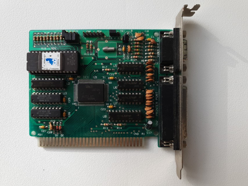 This is a CGA and Hercules-compatible card with a VDL ASIC at its heart. I'm not too sure what the 'Auto G7' name implies but I would assume it's just another Chips & Technologies 82C425 or 82C426 CGA CRT controller chip. The card has 32 KB of video memory soldered in, and the EPROM chip is the same as a UM2311 used to store display fonts. As with many old ISA graphics cards, it also has a parallel port on-board to support a printer.