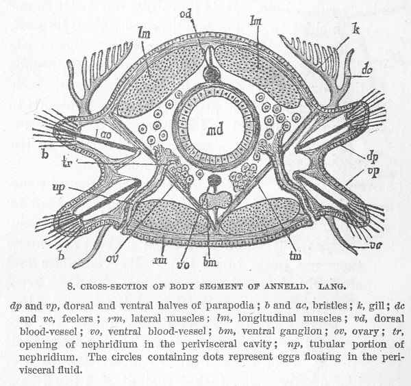 | Worms and the development of organs. — Mollusks: The external protective skeleton leads to degeneration or stagnation. — Annelids and arthropods: The external locomotive skeleton leads to temporary rapid advance, but fails of the goal. — Its disadvantages. — Vertebrates: The internal locomotive skeleton leads to backbone and brain. — Reasons for their dominance. — The primitive vertebrate. | |