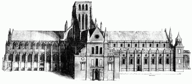 Wenceslaus Hollar—to whose engravings of Old St. Paul's we are indebted for our exceptional knowledge of the aspect of a building that has perished—was born in Prague in 1607, and was brought to England by the Earl of Arundel, who had seen some of his work at Cologne. He soon obtained profitable employment, producing engravings both of figures and views in rapid succession, and about 1639 he was appointed drawing-master to the Prince of Wales, afterwards Charles II. On the outbreak of the Civil War he served as a soldier in the Royalist ranks, and was taken prisoner at Basing House, but escaped to Antwerp. Obtaining very poor employment there, he returned to England in 1652, and was engaged upon the plates for Dugdale's History of St. Paul's and other works, for which, however, he is said by Vertue to have received very small pay, about fourpence an hour, "at his usual method by the hour-glass."