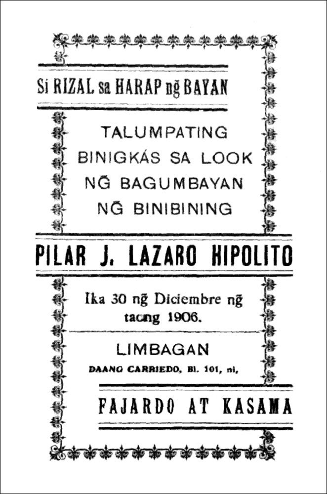 ¿Natupad caya ang nais na hadlang̃an ang bawa't tung̃o ni Rizal? ¡ah! hindi ng̃a at lalong nagsigla, bagcus nag alab ang sidhi ng̃ namumuksa, sumulac ang dugo at mandi'y iniukit sa pitac ng̃ dibdib, caya't hindi tinugutan hangang sa maibagsac ang pamamahalang walang matuid na pinanaPáhiná 10nangnan ang sulsol at hicayat ng̃ ilang malabis nating kinapopootan.