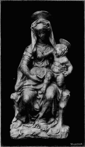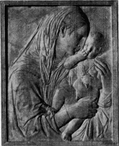 Die Richtung dieses Meisters hat mit der des Quercia in Siena manche Verwandtschaft, weshalb dieser auch gewöhnlich als der Urheber der hier in Frage kommenden Thonwerke gilt. Aber neben dem Meister der Pellegrinikapelle sehen wir noch verschiedene florentiner Bildner dieselbe Richtung verfolgen, und zwar meist freier und naturalistischer. Von eigenartiger Größe in der Erfindung erscheint ein Künstler, dem die Maria mit dem schlafenden Kinde (No. 112B) angehört. Ähnlich groß empfunden ist die Maria, welche das nackte, vor ihr stehende [54]Kind kitzelt (No. 112A). Einem anderen Meister gehören ein Paar große Madonnenkompositionen, denen besonders zarte Empfindung und reiche Gewandung eigentümlich ist (No. 109C und D). Besonders häufig als Stuckreliefs verbreitet sind verschiedene unter sich nahe verwandte Madonnen, in denen sich das Kind zärtlich an die Mutter anschmiegt; alle, wie das nebenstehend abgebildete Relief (No. 109), ausgezeichnet durch die glückliche Gruppierung von Mutter und Kind, das innige, rein menschliche Verhältnis zwischen beiden und die einfache, volle Faltengebung; nur in der Ausführung der Extremitäten, namentlich der Hände, verrät sich noch ein naturalistisch nicht zu voller Freiheit durchgebildeter Künstler.