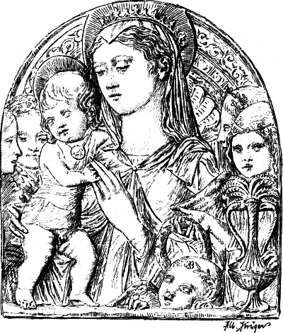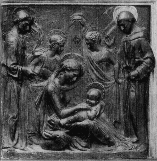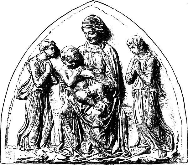 Neben Ghiberti hat eine kleine Gruppe von gleichzeitigen florentiner Bildhauern, die ihrem Namen nach meist noch unbekannt sind, in ihrer Stellung zwischen der älteren und der neuen Zeit eine verwandte, eigene Bedeutung. Während sie dem Ghiberti an Phantasie und schöpferischem Talent weit nachstehen, in der naturalistischen Durchbildung oft noch hinter ihm zurückbleiben und in ihrer Ornamentik an den überlieferten gotischen Formen festhalten, die sie in barocker Weise ausbilden, zeigen sie doch gerade in der Auffassung einen modernen naturalistischen Zug, der Ghiberti noch abgeht. Ihre einfachen Kompositionen oder Einzelfiguren sind durch Naivetät und Natürlichkeit der Empfindung ausgezeichnet; namentlich in der Madonna, die außerordentlich häufig von ihnen dargestellt ist, bringen sie das rein menschliche Verhältnis von Mutter und Kind mit eben so viel Einfachheit wie Zartheit der Empfindung zum Ausdruck. Mit ihrer Auffassungsweise sind sie offenbar der Anschauung des Volkes entgegengekommen; dies beweist schon der Umstand, daß sie regelmäßig den billigen Thon zur Ausführung ihrer Werke wählen, und daß gerade durch ihre Arbeiten sich als häuslicher Andachtsgegenstand der [51]Florentiner das Madonnenrelief, an Stelle des Madonnenbildes im Trecento, einbürgert. In diesen Madonnenreliefs, die, in bemaltem Thon oder Stuck ausgeführt, auch dem wenig bemittelten Bürger zugänglich waren, sind die häuslichen Bürgertugenden des Florentiners dieser Zeit: Keuschheit und Liebe zwischen Eltern und Kindern, in der edelsten Weise verklärt zum Ausdruck gebracht.
