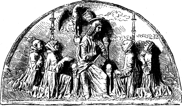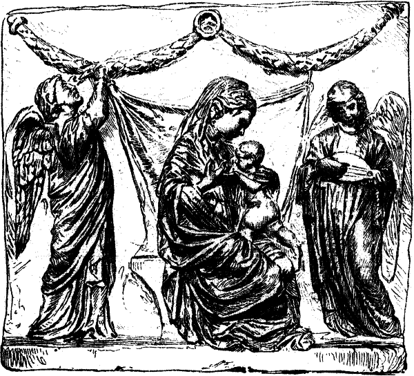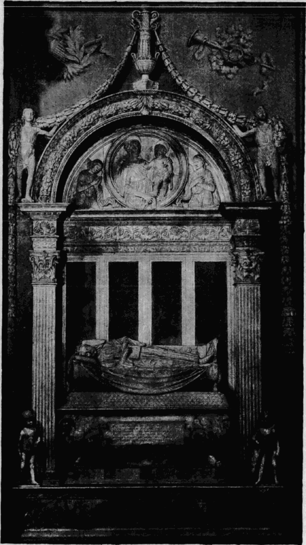 Dadurch, daß der Mittelpunkt für die Thätigkeit der Bildhauer auch im Quattrocento nach wie vor die Kirche ist, bleiben auch die Aufgaben der Plastik im Wesentlichen dieselben wie vorher. Der Schmuck der Fassaden, die monumentalen Ausstattungsstücke des Innern: Altar, Kanzel, Sängertribüne, Tabernakel, Sakristeibrunnen, Kandelaber, Chorschranken werden, wo es immer angeht, einem Bildhauer zur Ausführung übergeben. Aber Auffassung und Formenbehandlung sind ganz neu; nicht nur durch die Aufnahme antiker Dekorationsformen, vor Allem sind die Künstler ihren Vorgängern durch ihr Stilgefühl und den monumentalen Sinn überlegen, indem sie jene Gegenstände regelmäßig architektonisch gestalten und figürliche Bildwerke nur zur Hebung der Form und als sinnige Erklärung ihrer Bedeutung anbringen. Die Grabmonumente, die jetzt eine so außerordentliche Bedeutung gewinnen und nicht selten fast die ganzen Wände der Kirchen bedecken, waren allerdings auch schon im Trecento an demselben Platze; aber an die Stelle des Heiligengrabes, das nur noch ausnahmsweise einen Stifter findet, tritt das Privatgrab und das Staatsdenkmal, und der von Säulen getragene, mit einem Baldachin überdachte Sarkophag des Trecento wird durch das geschmackvolle, der Architektur sich einfügende Nischengrab verdrängt. Über dem Sarkophag [38]ist auf dem Paradebett der Verstorbene in seiner Amtstracht feierlich ausgestellt; den oberen Abschluß der meist sehr fein gegliederten und zierlich dekorierten Nische pflegt ein Relief mit der Madonna zu bilden, zu deren Seiten anbetende Engel.