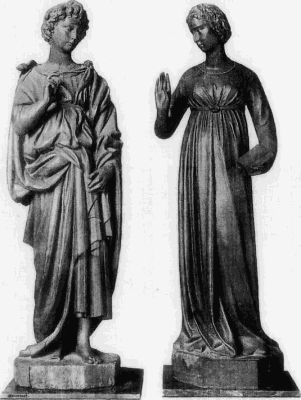 Am Ausgange des XIV. Jahrh. stellt sich die Plastik in ganz Italien in sehr unvorteilhafter Weise als ein gedankenloses Ausleben der Richtung der jüngeren Pisani dar, der jedes ernstere Naturstudium, jede naive Anschauung fehlte. Erst um die Wende des Jahrhunderts macht sich in Florenz ein frischer naturalistischer Zug in dekorativen Arbeiten, namentlich an den Domthüren geltend. Tritt derselbe in den Laibungen des Südportals, die zwischen den Jahren 1386 und 1402 von einem Piero di Giovanni Tedesco gearbeitet wurden, in den spielenden nackten Engeln zwischen naturalistischem Rankenwerk, noch befangen [49]und selbst ungeschickt zu Tage, so ist in den Laibungen des Nordportals, welches 1408 von Niccolo d’Arezzo begonnen und von Antonio di Banco (unter Beihülfe seines Sohnes Giovanni) beendet wurde, sowohl in der Durchbildung der Ornamente wie der Figürchen darin eine Wiedergeburt aufs Entschiedenste angestrebt, freilich auf Grundlage der gotischen Formen und der Entwickelung des Trecento. Während daher die lebensgroßen Figuren derselben Künstler (besonders im Dom zu Florenz) noch altertümlich und befangen erscheinen, sind ihre kleinen Figuren durch die geschmackvolle Anordnung, zarte Empfindung und zierliche Durchführung schon fast modern im Sinne des Quattrocento.
