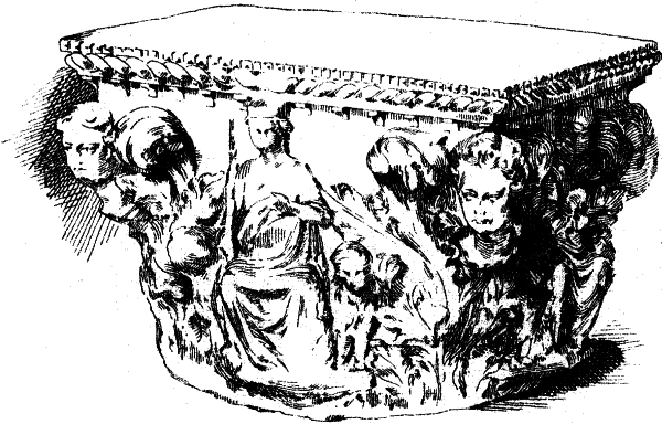 Noch ausschließlicher als in Süditalien und Venedig bleibt in Rom die Thätigkeit der Bildhauer auf rein dekorative Arbeiten beschränkt; ja diese verzichtet selbst auf eigentlich plastische Ornamentik und bildet dafür ein zierliches und farbenreiches musivisches Schmucksystem aus, welches mit Anlehnung an antike Vorbilder aus dem unerschöpflichen Vorrat an römischen Baustücken in wertvollen Steinen aller Art sein Material herbeiholt und gerade durch die Fülle und den Wert desselben zur Ausbildung dieser Dekorationsweise angeregt wurde; als Cosmatenarbeit benannt, weil namentlich der Marmorarius Cosmas und seine Familie dieselbe ausübte. Ein Beispiel dafür, doch schon aus späterer Zeit, bietet die Aschenurne (No. 31).