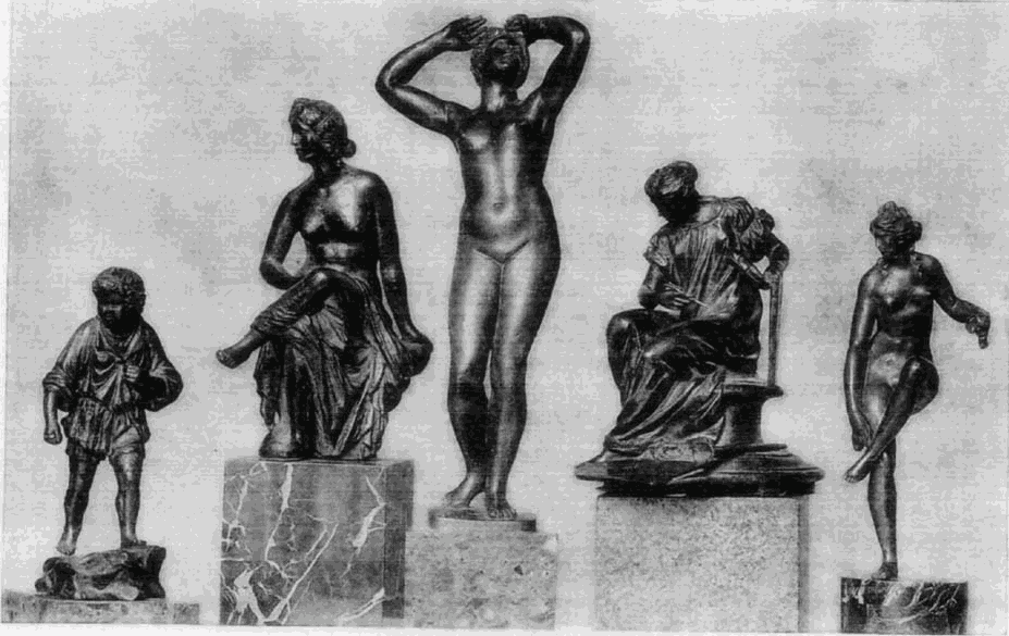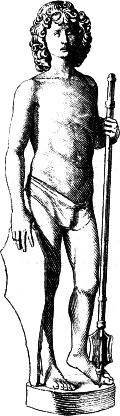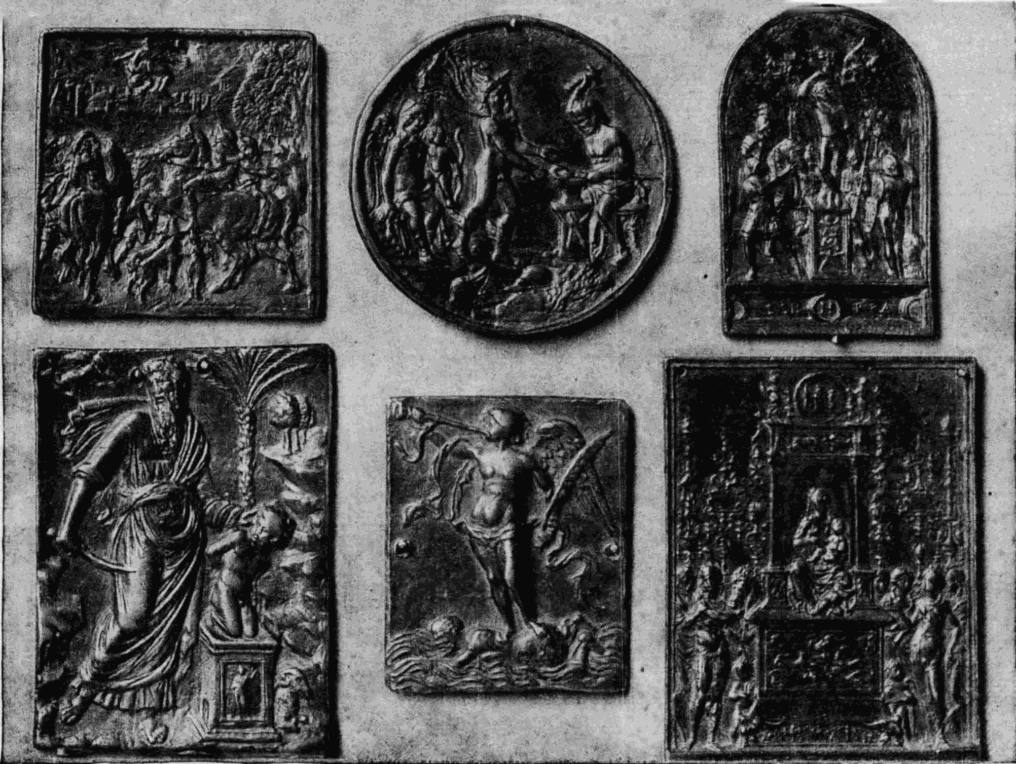 Die Verehrung der Antike und das Studium derselben weckte auch in den Bildhauern das Interesse an den Stoffen aus der antiken Mythologie und Geschichte. Da die große Kunst fast ausschließlich auf kirchliche Aufgaben beschränkt blieb, so war es die für die Privaten beschäftigte Kleinkunst, in welcher die Freude an solchen Stoffen volle Bethätigung finden konnte; in der Plastik insbesondere der bildnerische Schmuck der kleinen Hausgeräte, wie Tintefässer, Leuchter, Schwertgriffe, Agraffen, Kästchen u. s. f., die uns heute meist nur in ihren einzelnen Teilen, den sogenannten Plaketten, erhalten sind, ferner die Rückseiten der Medaillen und die Kameen. Die Motive sind zumeist den bekanntesten römischen Klassikern, namentlich Ovid und Livius entlehnt und je nach der Bestimmung des Gegenstandes mit [40]feiner Beziehung ausgewählt: an den Schwertgriffen finden wir regelmäßig Thaten der mythischen römischen Helden, die Herkulesarbeiten oder ähnliche Darstellungen, an den Agraffen Venus und Amor, die Liebschaften der Götter u. dergl.