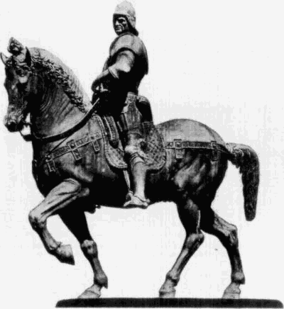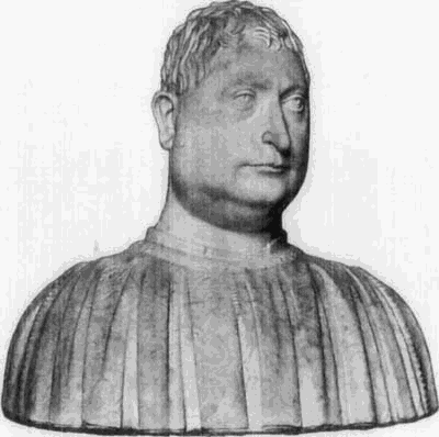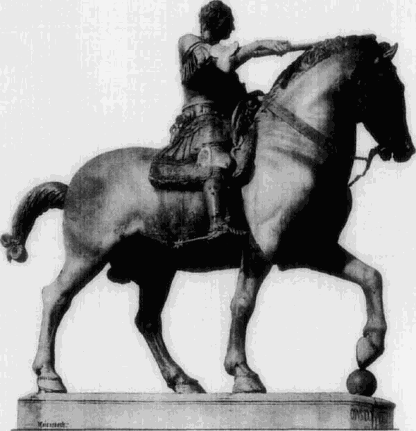 Die plastische Darstellung des Porträts, im XIV. Jahrh. fast ganz zurückgedrängt, erhält im XV. Jahrh., in Folge der bis zum rücksichtslosesten Egoismus ausgebildeten Individualität und der Ruhmsucht der Zeit, eine hervorragende Bedeutung; jedoch fast ausschließlich als Büste oder als Reliefporträt. Die Porträtstatue fehlt fast ganz; einige Statuen auf Dogengräbern ausgenommen, begnügte man sich damit, Heiligenfiguren die Züge berühmter Zeitgenossen zu geben (wie dies z. B. bei mehreren Prophetenstatuen Donatello’s am Campanile der Fall ist). Eine Ausnahme machte man nur mit der Reiterstatue, welche schon von einzelnen Tyrannen des Trecento als vornehmstes Denkmal ihres Ruhmes bevorzugt war. [47]Während der Reiter in der norditalienischen Kunst, im Anschluß an jene älteren Denkmäler, eine mehr reliefartig gedachte Figur innerhalb eines reichen Monumentes bleibt, haben die Florentiner Donatello und Verrocchio im Gattamelata und Colleoni selbständige Reitermonumente geschaffen, die in ihrem Aufbau und in der gewaltigen individuellen Wirkung von Roß und Reiter zu den großartigsten Monumenten aller Zeiten zählen.