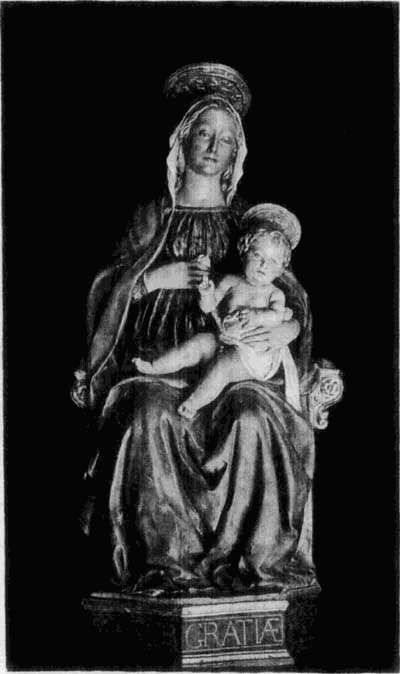 Am altertümlichsten und zugleich am befangensten erscheint ein Künstler, der besonders häufig vorkommt und in Norditalien, in Sta. Anastasia zu Verona, im Dom zu Modena und in Venedig eine bedeutendere Thätigkeit entwickelt hat. Schon in seiner architektonischen Umrahmung zeigt er eine eigentümlich barocke Mischung plumper gotischer und schlecht verstandener Renaissanceformen. Die unsichere, ausgeschwungene Haltung seiner Figuren, die kleinen Köpfe, die langen Falten der schweren Stoffe mit ihren Schnörkeln, wo sie auf den Boden aufstoßen, die mangelhafte Durchbildung, namentlich die knochen- und gelenklose Bildung der Körper verraten einen Bildner, der in den Traditionen des Trecento aufgewachsen ist und nicht eigene Kraft genug hat, sich von ihnen los zu machen. Die große vorspringende Stirn, die überstehende Oberlippe, das kleine zurücktretende Kinn und der treuherzige Ausdruck der tiefliegenden Augen sind die bezeichnenden Züge seiner Köpfe, die ihn ebenso leicht erkennen lassen, wie seine Ornamente und [53]seine Gewandgebung. Von seiner Hand besitzt das Berliner Museum einen seiner charakteristischen Altäre (No. 108), eine Madonnenstatuette (No. 107) und ein oder zwei kleine Madonnenreliefs (No. 108A und B). In diesen Gruppen von schlichter Zuständlichkeit entschädigt die Innigkeit der Empfindung für das Fehlen naturalistischer Durchbildung. Weit geringer erscheint der Künstler aber in größeren und bewegten Gruppen, wie in den Passionsscenen der Pellegrinikapelle in Sa. Anastasia zu Verona, seiner umfangreichsten Arbeit, nach der er als der Meister der Pellegrinikapelle (von Einigen mit Rosso identificiert, von Andern als Dello Delli bezeichnet) benannt zu werden pflegt.