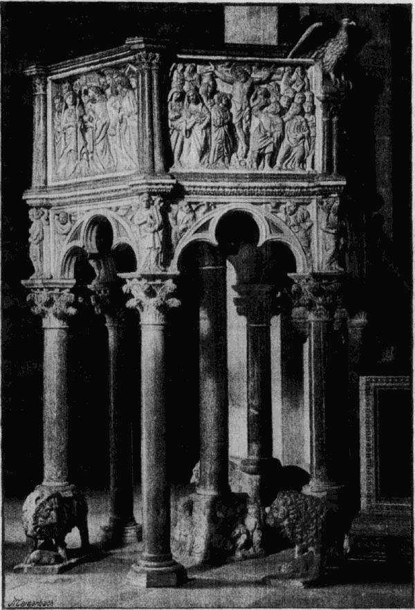 In der Kanzel zu Pisa fällt diesen Arbeiten gegenüber der engere Anschluß an die antiken Vorbilder in seinen Vorzügen [18]und Nachteilen ins Auge. Was über den Künstler im Allgemeinen gesagt ist, gilt für dieses sein Hauptwerk im Besonderen. Wenn ihm Mangel an Innerlichkeit in den einzelnen Darstellungen vorgeworfen werden muß und dadurch die Auffassung als eine wenig kirchliche erscheint, so ist dafür die Kanzel in dem Zusammenhang der Darstellungen, in dem Ideengehalt ihres Bilderschmuckes um so mehr durchdacht, um so tiefer und gewaltiger. Das Evangelium von der Erlösung ist der Grundgedanke, der in allen seinen Teilen hier zum ersten Mal völlig klar durchgeführt ist, von den Verheißungen durch die Propheten an, dann in den einzelnen geschichtlichen Thatsachen bis zu den Wirkungen, die in den Gestalten der christlichen Tugenden verkörpert sind und in den Tieren als Träger der Säulen und Lesepulte ihren symbolischen Ausdruck erhalten. Der Inhalt der Predigt, für welche die Kanzel geschaffen ist, ist wohl nie wieder so eindringlich der gläubigen Gemeinde bildnerisch zur Anschauung gebracht worden.