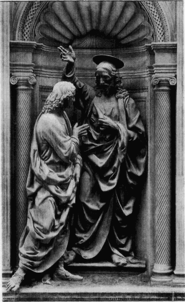 In der Art der plastischen Darstellung bringt das Quattrocento die völlige Befreiung und stilvolle Ausbildung der verschiedenen Gattungen, welche das Trecento nur teilweise und vermischt gekannt hatte. Die Freifigur in ihrer vollen naturalistischen Durchbildung wird schon im ersten Jahrzehnt des XV. Jahrh., namentlich durch Donatello, eine der wichtigsten Aufgaben der Plastik. Sie wird jetzt meist schon mit Rücksicht auf den Platz ihrer Aufstellung gebildet, sowohl der stilistischen Rücksicht auf das Bauwerk, wie nicht selten auch der perspektiven Rücksicht auf den Standpunkt des Beschauers. Selbst vor der Zusammenordnung verschiedener Figuren zur Gruppe scheut die Zeit nicht zurück. Die vier Heiligen des Nanni di Banco in einer der Nischen von Or San Michele in Florenz sind zwar noch zufällig neben einander gestellte Freifiguren; aber Donatello’s Bronzegruppe der Judith über den Leichnam des Holofernes, die Gruppen der Begegnung Mariä mit Elisabeth von Andrea della Robbia in Pistoja und die Begrüßung der Heiligen Franz und Dominicus von demselben Künstler unter der Halle auf Piazza S. Maria Novella, sowie Verrocchio’s »Christus und Thomas« an Or San Michele in Florenz entsprechen in Komposition, Bewegung und Ausdruck als Gruppe wie in den Einzelfiguren den höchsten künstlerischen Anforderungen.