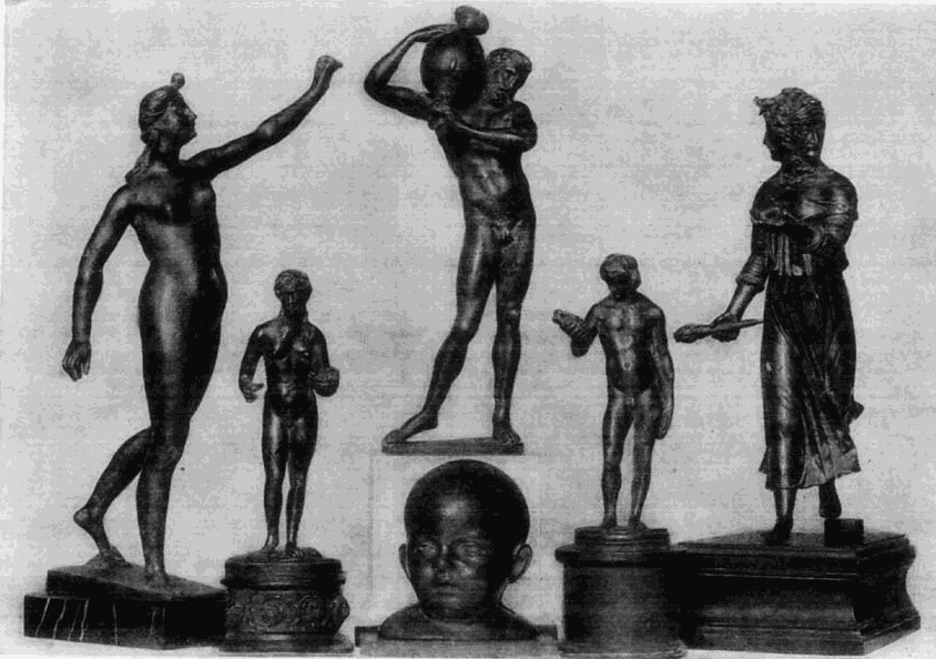 Neu, wenn auch nicht als Material, so doch im Umfange und in der Art seiner Verwendung, ist die Bronze. Nach den Arbeiten der byzantinischen Künstler war die Bronzethür des Andrea Pisano der erste vereinzelte Versuch eines Bronzegusses im Großen gewesen; im XV. Jahrh. gewann derselbe eine solche Bedeutung und damit allmählich auch eine solche künstlerische Ausbildung, daß die Bronze offenbar als das vornehmste Material für plastische Monumente jeder Art angesehen wurde. Anfangs auf den Guß von Reliefs beschränkt, wurde die Bronzeplastik bald auch auf Statuen, Büsten und Werke der Kleinkunst ausgedehnt; und während in der ersten Hälfte des Jahrhunderts Statuetten noch voll gegossen werden mußten und viele Güsse so ungenügend gelangen, daß die Ciselierung einen hervorragenden Anteil an der Fertigstellung der Bronzen hatte, sind die späteren Bronzen schon dünn und leicht und, bei kleineren Bildwerken, häufig à cire perdue gegossen und ganz unciseliert gelassen. Die Güsse scheinen meist über Wachsmodelle ausgeführt zu sein. Die Patina wurde, da der Besteller [42]nicht Jahre lang warten wollte, bis der Einfluß der Luft Patina bildete, regelmäßig künstlich hergestellt, indem die Bronzen mit einer schwärzlichen pechartigen Masse überzogen wurden, die wahrscheinlich poliert worden ist. Mit der Zeit ging diese durch Berührung von den Höhen ab; hier bildete sich dann eine natürliche Patina, die in Verbindung mit jener künstlichen Patina in den Tiefen mit ihrem schwärzlichen stumpfen Ton von feiner malerischer Wirkung ist.
