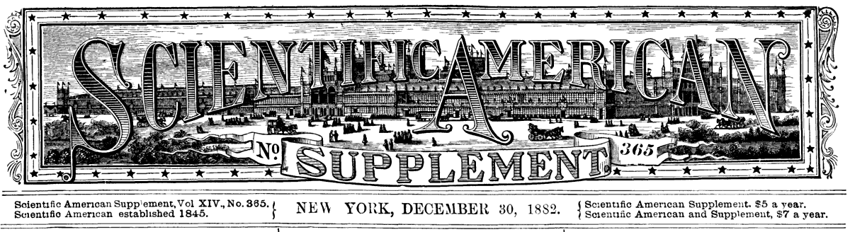 The Project Gutenberg EBook of Scientific American Supplement, No. 365, December 30, 1882, by Various This eBook is for the use of anyone anywhere at no cost and with almost no restrictions whatsoever. You may copy it, give it away or re-use it under the terms of the Project Gutenberg License included with this eBook or online at www.gutenberg.org Title: Scientific American Supplement, No. 365, December 30, 1882 Author: Various Release Date: July 6, 2006 [EBook #18763] Language: English Character set encoding: ISO-8859-1 *** START OF THIS PROJECT GUTENBERG EBOOK SCIENTIFIC AMERICAN *** Produced by David King, Juliet Sutherland and the Online Distributed Proofreading Team at http://www.pgdp.net