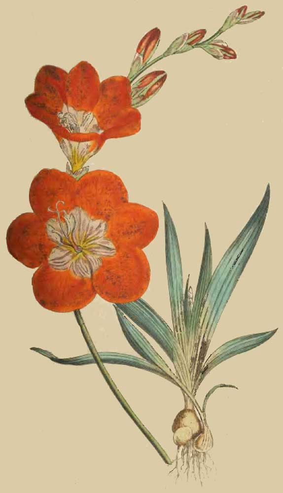 To the Cape of Good Hope, that never-failing source of rare and beautiful plants, we are indebted for most of our Ixias, and among others for the present species, which though not of that value, nor possessing the delicacy or fragrance of the blossoms of some others, is a very desirable plant, not only as an object of curiosity, from the transparency of the base of the corolla, but as it adds much to the brilliancy of a collection, is easily obtained, and as easily propagated.