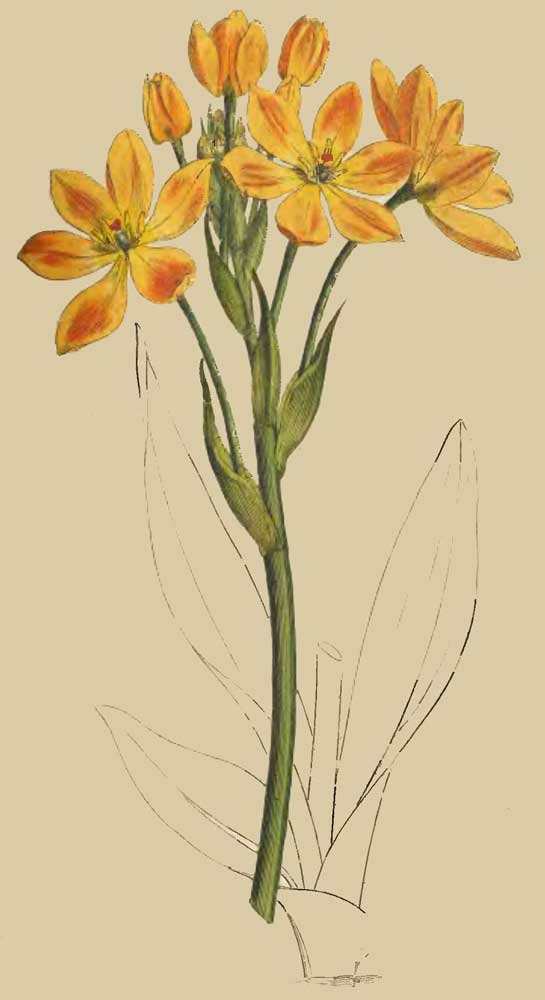 IXIA crocata foliis ensiformibus, floribus alternis, tubo longitudine bractearum, corollæ laminis ovatis integerrimis basi hyalinis. Ait. Hort. Kew. p. 60. V. 1.