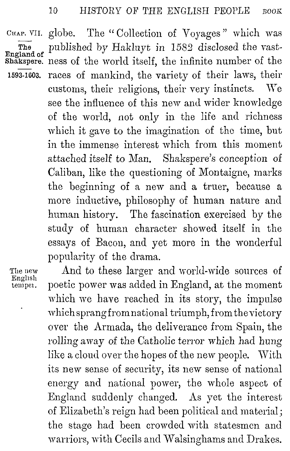 But to the national and local influences which 5-009]were telling on English literature was added that of the restlessness and curiosity which characterized the age. At the moment which we have reached the sphere of human interest was widened as it has never been widened before or since by the revelation of a new heaven and a new earth. It was only in the later years of the sixteenth century that the discoveries of Copernicus were brought home to the general intelligence of mankind by Kepler and Galileo, or that the daring of the Buccaneers broke through the veil which the greed of Spain had drawn across the New World of Columbus. Hardly inferior to these revelations as a source of intellectual impulse was the sudden and picturesque way in which the various races of the world were brought face to face with one another through the universal passion for foreign travel. While the red tribes of the West were described by Amerigo Vespucci, and the strange civilization of Mexico and Peru disclosed by Cortes and Pizarro, the voyages of the Portuguese threw open the older splendours of the East, and the story of India and China was told for the first time to Christendom by Maffei and Mendoza. England took her full part in this work of discovery. Jenkinson, an English traveller, made his way to Bokhara. Willoughby brought back Muscovy to the knowledge of Western Europe. English mariners penetrated among the Esquimaux, or settled in Virginia. Drake circumnavigated the 5-010]globe. The "Collection of Voyages" which was published by Hakluyt in 1582 disclosed the vastness of the world itself, the infinite number of the races of mankind, the variety of their laws, their customs, their religions, their very instincts. We see the influence of this new and wider knowledge of the world, not only in the life and richness which it gave to the imagination of the time, but in the immense interest which from this moment attached itself to Man. Shakspere's conception of Caliban, like the questioning of Montaigne, marks the beginning of a new and a truer, because a more inductive, philosophy of human nature and human history. The fascination exercised by the study of human character showed itself in the essays of Bacon, and yet more in the wonderful popularity of the drama.