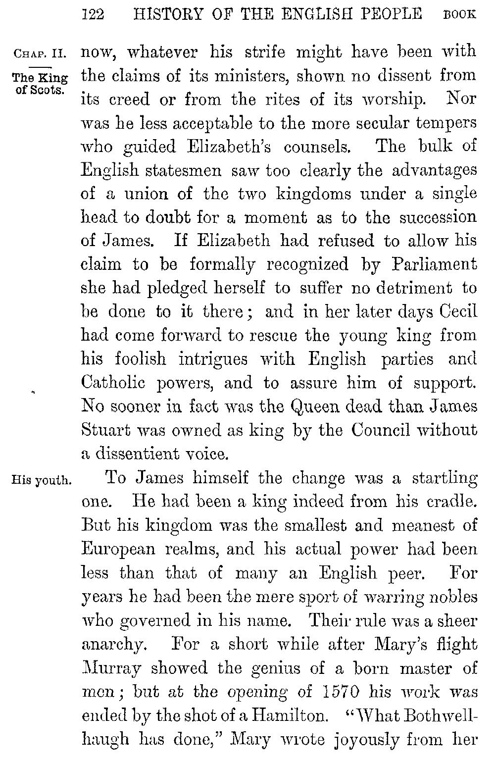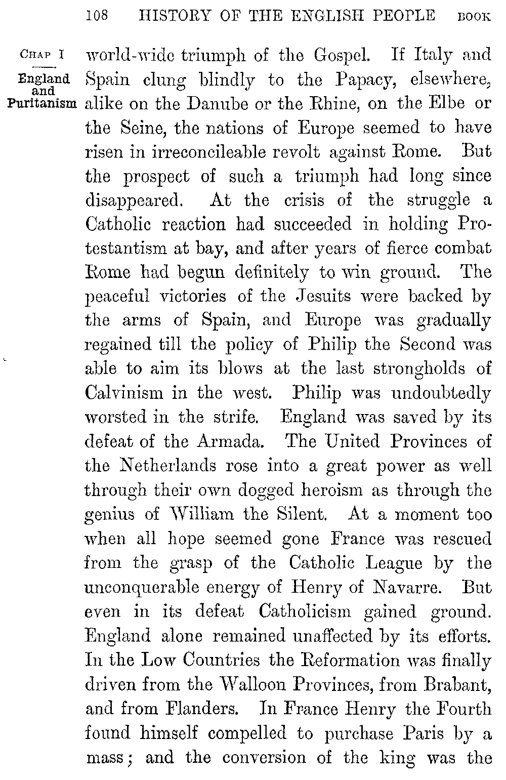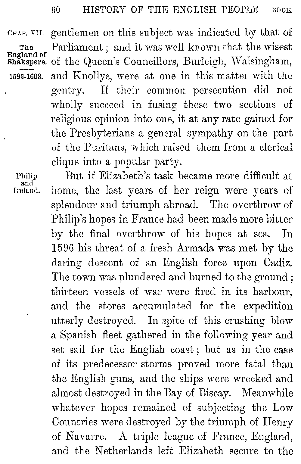 And to these larger and world-wide sources of poetic power was added in England, at the moment which we have reached in its story, the impulse which sprang from national triumph, from the victory over the Armada, the deliverance from Spain, the rolling away of the Catholic terror which had hung like a cloud over the hopes of the new people. With its new sense of security, its new sense of national energy and national power, the whole aspect of England suddenly changed. As yet the interest of Elizabeth's reign had been political and material; the stage had been crowded with statesmen and warriors, with Cecils and Walsinghams and Drakes. 5-011]Literature had hardly found a place in the glories of the time. But from the moment when the Armada drifted back broken to Ferrol the figures of warriors and statesmen were dwarfed by the grander figures of poets and philosophers. Amidst the throng in Elizabeth's antechamber the noblest form is that of the singer who lays the "Faerie Queen" at her feet, or of the young lawyer who muses amid the splendours of the presence over the problems of the "Novum Organum." The triumph at Cadiz, the conquest of Ireland, pass unheeded as we watch Hooker building up his "Ecclesiastical Polity" among the sheepfolds, or the genius of Shakspere rising year by year into supremer grandeur in a rude theatre beside the Thames.