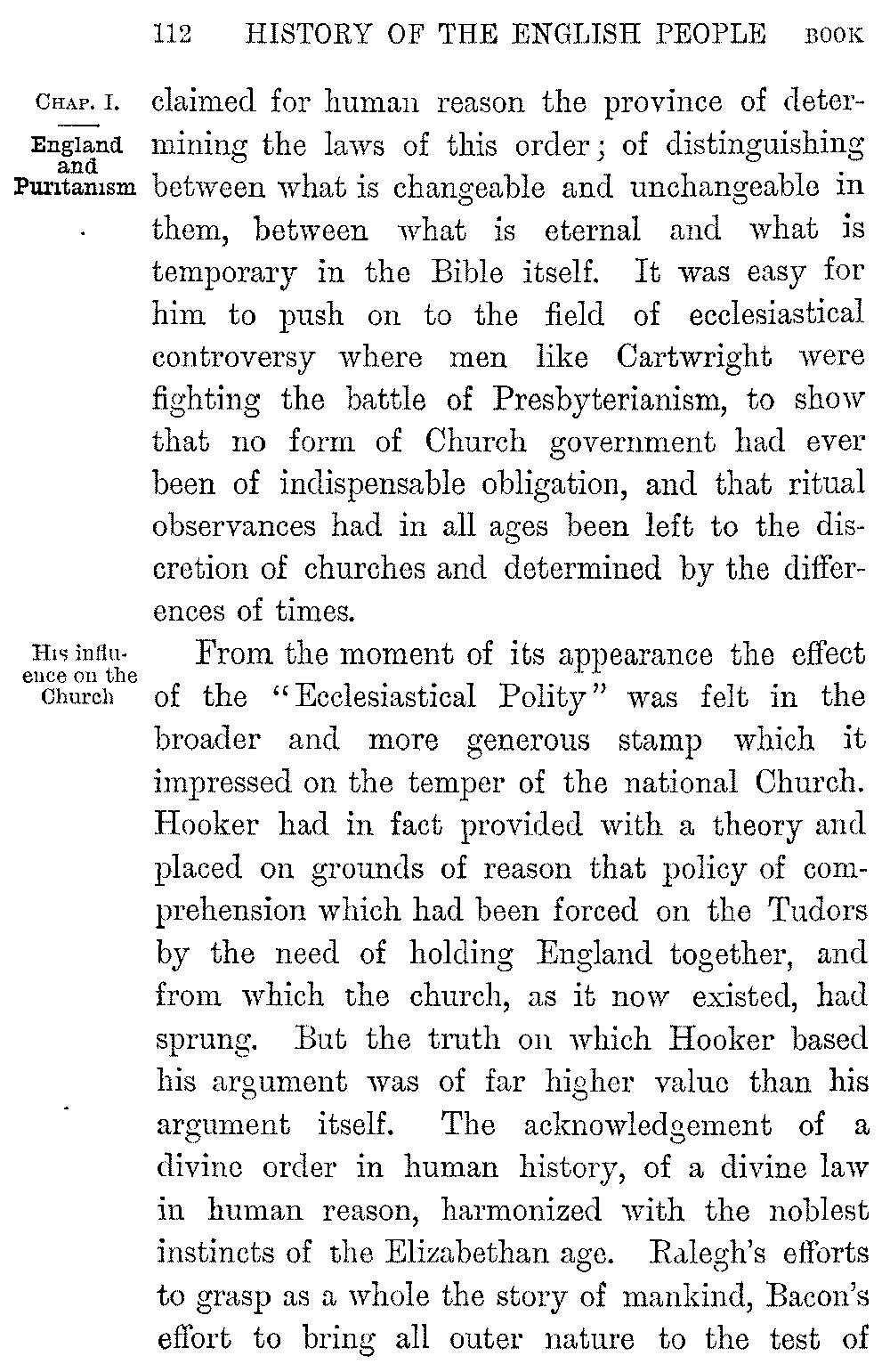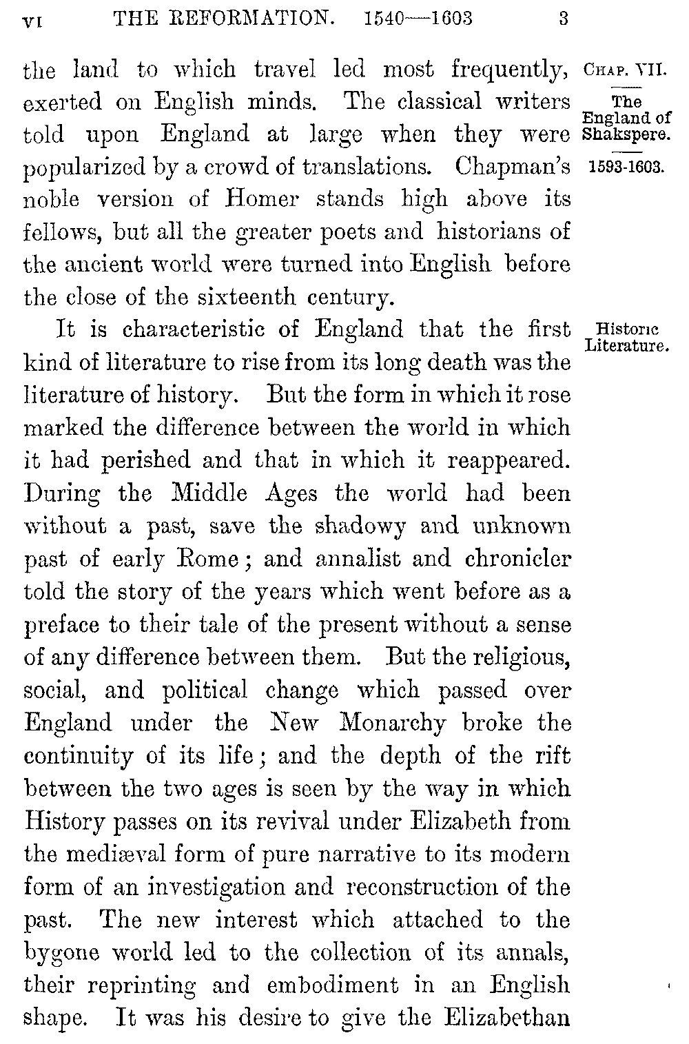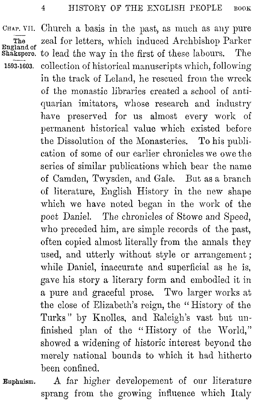 It is characteristic of England that the first kind of literature to rise from its long death was the literature of history. But the form in which it rose marked the difference between the world in which it had perished and that in which it reappeared. During the Middle Ages the world had been without a past, save the shadowy and unknown past of early Rome; and annalist and chronicler told the story of the years which went before as a preface to their tale of the present without a sense of any difference between them. But the religious, social, and political change which passed over England under the New Monarchy broke the continuity of its life; and the depth of the rift between the two ages is seen by the way in which History passes on its revival under Elizabeth from the mediæval form of pure narrative to its modern form of an investigation and reconstruction of the past. The new interest which attached to the bygone world led to the collection of its annals, their reprinting and embodiment in an English shape. It was his desire to give the Elizabethan 5-004]Church a basis in the past, as much as any pure zeal for letters, which induced Archbishop Parker to lead the way in the first of these labours. The collection of historical manuscripts which, following in the track of Leland, he rescued from the wreck of the monastic libraries created a school of antiquarian imitators, whose research and industry have preserved for us almost every work of permanent historical value which existed before the Dissolution of the Monasteries. To his publication of some of our earlier chronicles we owe the series of similar publications which bear the name of Camden, Twysden, and Gale. But as a branch of literature, English History in the new shape which we have noted began in the work of the poet Daniel. The chronicles of Stowe and Speed, who preceded him, are simple records of the past, often copied almost literally from the annals they used, and utterly without style or arrangement; while Daniel, inaccurate and superficial as he is, gave his story a literary form and embodied it in a pure and graceful prose. Two larger works at the close of Elizabeth's reign, the "History of the Turks" by Knolles, and Raleigh's vast but unfinished plan of the "History of the World," showed a widening of historic interest beyond the merely national bounds to which it had hitherto been confined.