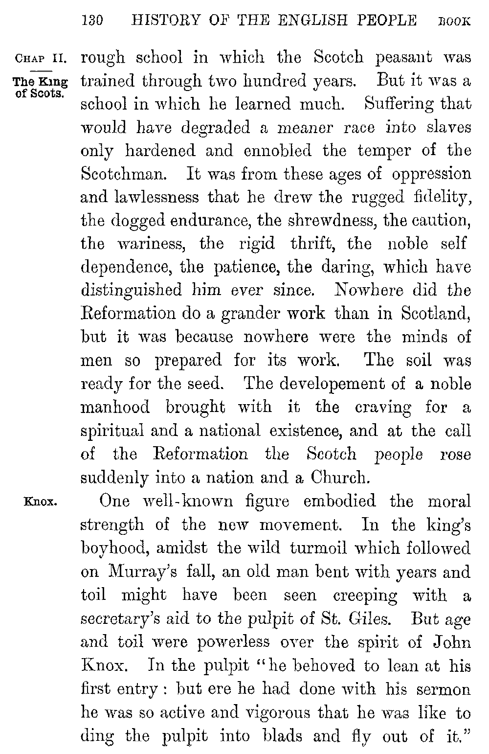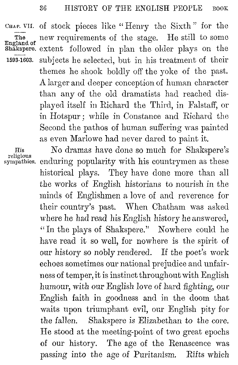 No dramas have done so much for Shakspere's enduring popularity with his countrymen as these historical plays. They have done more than all the works of English historians to nourish in the minds of Englishmen a love of and reverence for their country's past. When Chatham was asked where he had read his English history he answered, "In the plays of Shakspere." Nowhere could he have read it so well, for nowhere is the spirit of our history so nobly rendered. If the poet's work echoes sometimes our national prejudice and unfairness of temper, it is instinct throughout with English humour, with our English love of hard fighting, our English faith in goodness and in the doom that waits upon triumphant evil, our English pity for the fallen. Shakspere is Elizabethan to the core. He stood at the meeting-point of two great epochs of our history. The age of the Renascence was passing into the age of Puritanism. Rifts which 5-037]were still little were widening every hour, and threatening ruin to the fabric of Church and State which the Tudors had built up. A new political world was rising into being; a world healthier, more really national, but less picturesque, less wrapt in the mystery and splendour that poets love. Great as were the faults of Puritanism, it may fairly claim to be the first political system which recognized the grandeur of the people as a whole. As great a change was passing over the spiritual sympathies of men. A sterner Protestantism was invigorating and ennobling life by its morality, its seriousness, its intense conviction of God. But it was at the same time hardening and narrowing it. The Bible was superseding Plutarch. The "obstinate questionings" which haunted the finer souls of the Renascence were being stereotyped into the theological formulas of the Puritan. The sense of a divine omnipotence was annihilating man. The daring which turned England into a people of "adventurers," the sense of inexhaustible resources, the buoyant freshness of youth, the intoxicating sense of beauty and joy, which created Sidney and Marlowe and Drake, were passing away before the consciousness of evil and the craving to order man's life aright before God.