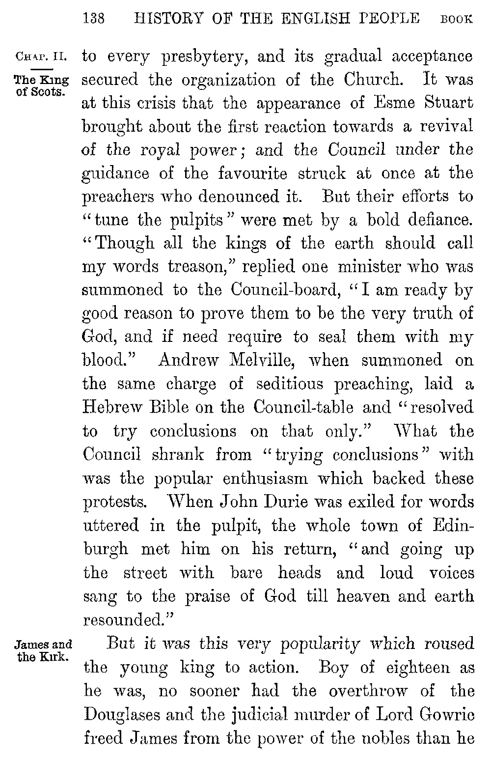 But in the "idlesse" and solitude of the poet's exile the great work begun in the two pleasant years of his stay at Penshurst had at last taken form, and it was to publish the first three books of the "Faerie Queen" that Spenser returned in Raleigh's company to London. The appearance of the "Faerie Queen" in 1590 is the one critical event in the annals of English poetry; it settled in fact the question whether there was to be such a thing as English poetry or no. The older national verse which had blossomed and died in Caedmon sprang suddenly into a grander life in Chaucer, but it closed again in a yet more complete death. Across the Border indeed the Scotch poets of the fifteenth century preserved something of their master's vivacity and colour, and in England itself the Italian poetry of the Renascence had of late found echoes in Surrey and Sidney. The new 5-014]English drama too was beginning to display its wonderful powers, and the work of Marlowe had already prepared the way for the work of Shakspere. But bright as was the promise of coming song, no great imaginative poem had broken the silence of English literature for nearly two hundred years when Spenser landed at Bristol with the "Faerie Queen." From that moment the stream of English poetry has flowed on without a break. There have been times, as in the years which immediately followed, when England has "become a nest of singing birds"; there have been times when song was scant and poor; but there never has been a time when England was wholly without a singer.