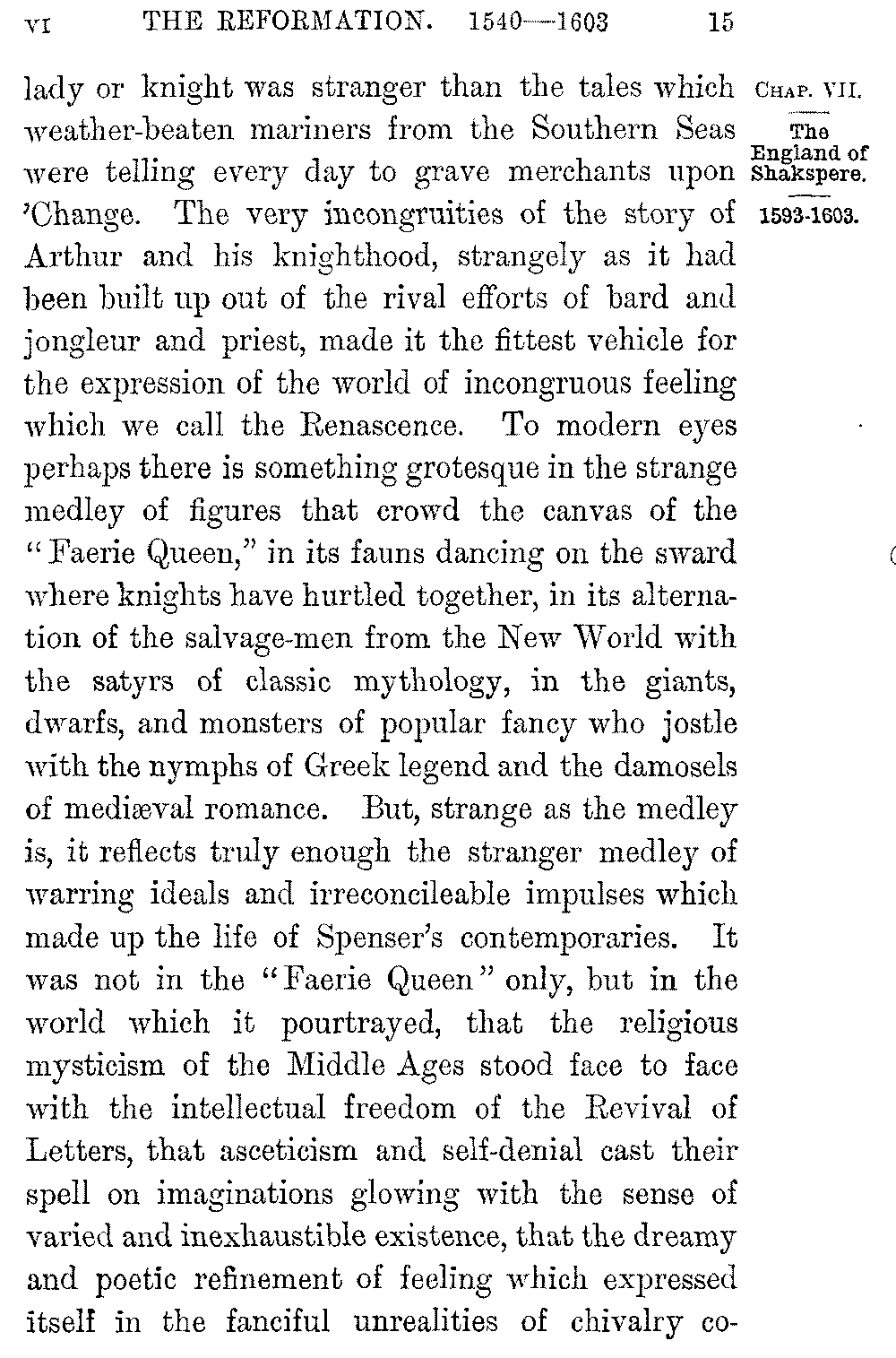 The new English verse has been true to the source from which it sprang, and Spenser has always been "the poet's poet." But in his own day he was the poet of England at large. The "Faerie Queen" was received with a burst of general welcome. It became "the delight of every accomplished gentleman, the model of every poet, the solace of every soldier." The poem expressed indeed the very life of the time. It was with a true poetic instinct that Spenser fell back for the framework of his story on the faery world of Celtic romance, whose wonder and mystery had in fact become the truest picture of the wonder and mystery of the world around him. In the age of Cortes and of Raleigh dreamland had ceased to be dreamland, and no marvel or adventure that befell 5-015]lady or knight was stranger than the tales which weather-beaten mariners from the Southern Seas were telling every day to grave merchants upon 'Change. The very incongruities of the story of Arthur and his knighthood, strangely as it had been built up out of the rival efforts of bard and jongleur and priest, made it the fittest vehicle for the expression of the world of incongruous feeling which we call the Renascence. To modern eyes perhaps there is something grotesque in the strange medley of figures that crowd the canvas of the "Faerie Queen," in its fauns dancing on the sward where knights have hurtled together, in its alternation of the salvage-men from the New World with the satyrs of classic mythology, in the giants, dwarfs, and monsters of popular fancy who jostle with the nymphs of Greek legend and the damosels of mediæval romance. But, strange as the medley is, it reflects truly enough the stranger medley of warring ideals and irreconcileable impulses which made up the life of Spenser's contemporaries. It was not in the "Faerie Queen" only, but in the world which it pourtrayed, that the religious mysticism of the Middle Ages stood face to face with the intellectual freedom of the Revival of Letters, that asceticism and self-denial cast their spell on imaginations glowing with the sense of varied and inexhaustible existence, that the dreamy and poetic refinement of feeling which expressed itself in the fanciful unrealities of chivalry 5-016]co-existed with the rough practical energy that sprang from an awakening sense of human power, or the lawless extravagance of an idealized friendship and love lived side by side with the moral sternness and elevation which England was drawing from the Reformation and the Bible.
