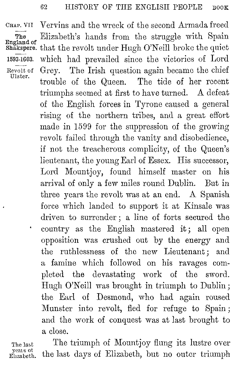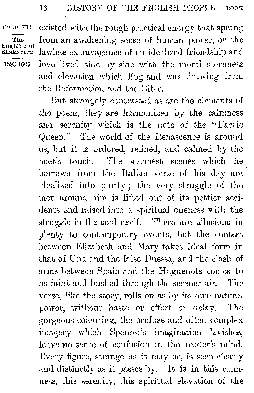 The glory of the new literature broke on England with Edmund Spenser. We know little of his life; he was born in 1552 in East London, the son of poor parents, but linked in blood with the Spencers of Althorpe, even then—as he proudly says—"a house of ancient fame." He studied as a sizar at Cambridge, and quitted the University while still a boy to live as a tutor in the north; but after some years of obscure poverty the scorn of a fair "Rosalind" drove him again southwards. A college friendship with Gabriel Harvey served to introduce him to Lord Leicester, who sent him as his envoy into France, and in whose service he first became acquainted with Leicester's nephew, Sir Philip Sidney. From Sidney's house at 5-012]Penshurst came in 1579 his earliest work, the "Shepherd's Calendar"; in form, like Sidney's own "Arcadia," a pastoral where love and loyalty and Puritanism jostled oddly with the fancied shepherd life. The peculiar melody and profuse imagination which the pastoral disclosed at once placed its author in the forefront of living poets, but a far greater work was already in hand; and from some words of Gabriel Harvey's we see Spenser bent on rivalling Ariosto, and even hoping "to overgo" the "Orlando Furioso" in his "Elvish Queen." The ill-will or the indifference of Burleigh however blasted the expectations he had drawn from the patronage of Sidney or Leicester, and from the favour with which he had been welcomed by the Queen. Sidney, in disgrace with Elizabeth through his opposition to the marriage with Anjou, withdrew to Wilton to write the "Arcadia" by his sister's side; and "discontent of my long fruitless stay in princes' courts," the poet tells us, "and expectation vain of idle hopes" drove Spenser into exile. In 1580 he followed Lord Grey as his secretary into Ireland, and remained there on the Deputy's recall in the enjoyment of an office and a grant of land from the forfeited estates of the Earl of Desmond. Spenser had thus enrolled himself among the colonists to whom England was looking at the time for the regeneration of Munster, and the practical interest he took in the "barren soil where cold and want and poverty do grow" was 5-013]shown by the later publication of a prose tractate on the condition and government of the island. It was at Dublin or in his castle of Kilcolman, two miles from Doneraile, "under the foot of Mole, that mountain hoar," that he spent the ten years in which Sidney died and Mary fell on the scaffold and the Armada came and went; and it was in the latter home that Walter Raleigh found him sitting "alwaies idle," as it seemed to his restless friend, "among the cooly shades of the green alders by the Mulla's shore" in a visit made memorable by the poem of "Colin Clout's come home again."