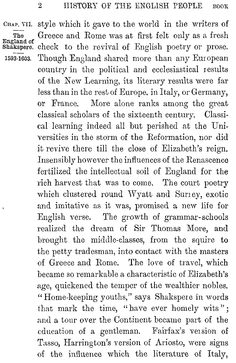 The defeat of the Armada, the deliverance from Catholicism and Spain, marked the critical moment in our political developement. From that hour England's destiny was fixed. She was to be a Protestant power. Her sphere of action was to be upon the seas. She was to claim her part in the New World of the West. But the moment was as critical in her intellectual developement. As yet English literature had lagged behind the literature of the rest of Western Christendom. It was now to take its place among the greatest literatures of the world. The general awakening of national life, the increase of wealth, of refinement, and leisure that characterized the reign of Elizabeth, was accompanied by a quickening of intelligence. The Renascence had done little for English letters. The overpowering influence of the new models both of thought and 5-002]style which it gave to the world in the writers of Greece and Rome was at first felt only as a fresh check to the revival of English poetry or prose. Though England shared more than any European country in the political and ecclesiastical results of the New Learning, its literary results were far less than in the rest of Europe, in Italy, or Germany, or France. More alone ranks among the great classical scholars of the sixteenth century. Classical learning indeed all but perished at the Universities in the storm of the Reformation, nor did it revive there till the close of Elizabeth's reign. Insensibly however the influences of the Renascence fertilized the intellectual soil of England for the rich harvest that was to come. The court poetry which clustered round Wyatt and Surrey, exotic and imitative as it was, promised a new life for English verse. The growth of grammar-schools realized the dream of Sir Thomas More, and brought the middle-classes, from the squire to the petty tradesman, into contact with the masters of Greece and Rome. The love of travel, which became so remarkable a characteristic of Elizabeth's age, quickened the temper of the wealthier nobles. "Home-keeping youths," says Shakspere in words that mark the time, "have ever homely wits"; and a tour over the Continent became part of the education of a gentleman. Fairfax's version of Tasso, Harrington's version of Ariosto, were signs of the influence which the literature of Italy, 5-003]the land to which travel led most frequently, exerted on English minds. The classical writers told upon England at large when they were popularized by a crowd of translations. Chapman's noble version of Homer stands high above its fellows, but all the greater poets and historians of the ancient world were turned into English before the close of the sixteenth century.