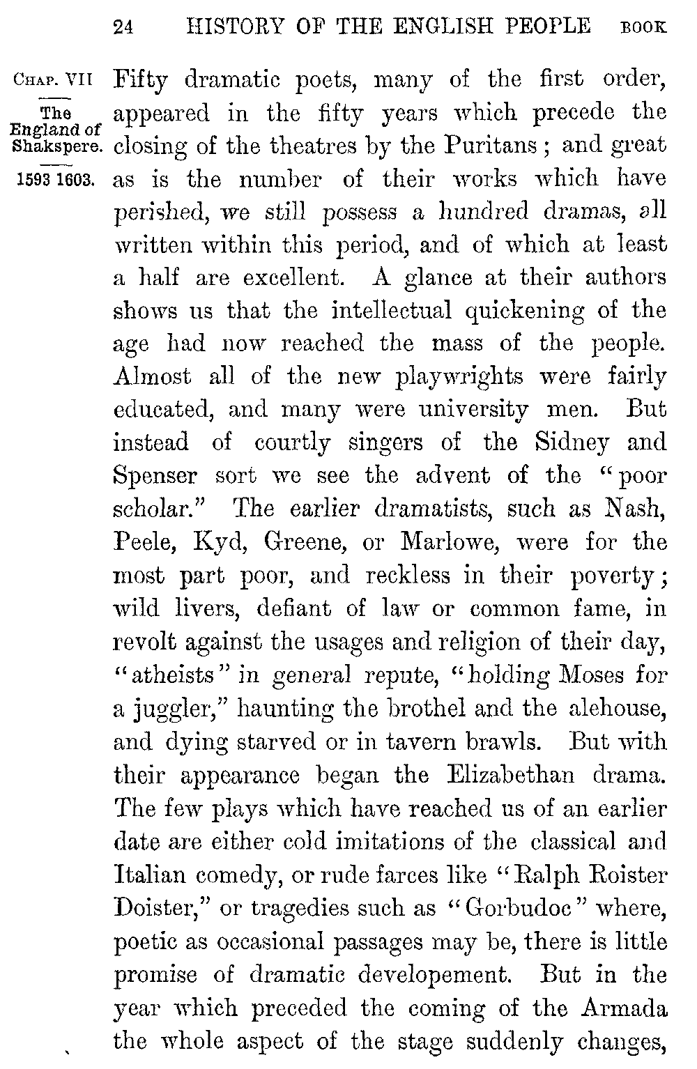 Few events in our literary history are so startling as this sudden rise of the Elizabethan drama. The first public theatre was erected only in the middle of the Queen's reign. Before the close of it eighteen theatres existed in London alone. 5-024]Fifty dramatic poets, many of the first order, appeared in the fifty years which precede the closing of the theatres by the Puritans; and great as is the number of their works which have perished, we still possess a hundred dramas, all written within this period, and of which at least a half are excellent. A glance at their authors shows us that the intellectual quickening of the age had now reached the mass of the people. Almost all of the new playwrights were fairly educated, and many were university men. But instead of courtly singers of the Sidney and Spenser sort we see the advent of the "poor scholar." The earlier dramatists, such as Nash, Peele, Kyd, Greene, or Marlowe, were for the most part poor, and reckless in their poverty; wild livers, defiant of law or common fame, in revolt against the usages and religion of their day, "atheists" in general repute, "holding Moses for a juggler," haunting the brothel and the alehouse, and dying starved or in tavern brawls. But with their appearance began the Elizabethan drama. The few plays which have reached us of an earlier date are either cold imitations of the classical and Italian comedy, or rude farces like "Ralph Roister Doister," or tragedies such as "Gorbudoc" where, poetic as occasional passages may be, there is little promise of dramatic developement. But in the year which preceded the coming of the Armada the whole aspect of the stage suddenly changes, 5-025]and the new dramatists range themselves around two men of very different genius, Robert Greene and Christopher Marlowe.