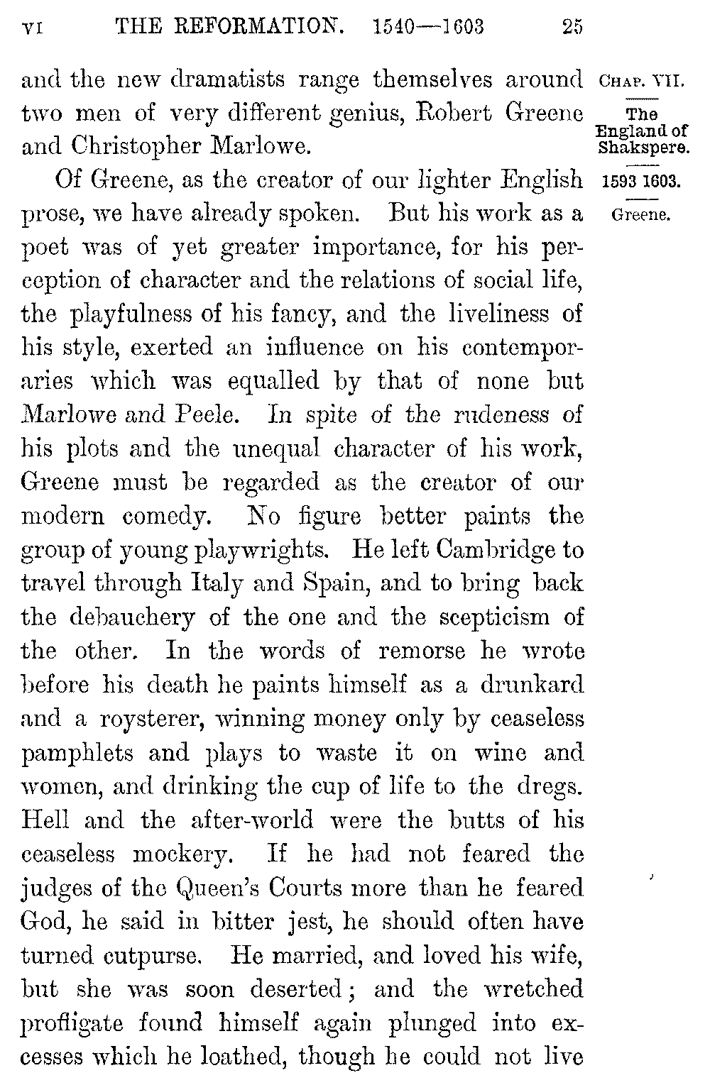 Of Greene, as the creator of our lighter English prose, we have already spoken. But his work as a poet was of yet greater importance, for his perception of character and the relations of social life, the playfulness of his fancy, and the liveliness of his style, exerted an influence on his contemporaries which was equalled by that of none but Marlowe and Peele. In spite of the rudeness of his plots and the unequal character of his work, Greene must be regarded as the creator of our modern comedy. No figure better paints the group of young playwrights. He left Cambridge to travel through Italy and Spain, and to bring back the debauchery of the one and the scepticism of the other. In the words of remorse he wrote before his death he paints himself as a drunkard and a roysterer, winning money only by ceaseless pamphlets and plays to waste it on wine and women, and drinking the cup of life to the dregs. Hell and the after-world were the butts of his ceaseless mockery. If he had not feared the judges of the Queen's Courts more than he feared God, he said in bitter jest, he should often have turned cutpurse. He married, and loved his wife, but she was soon deserted; and the wretched profligate found himself again plunged into excesses which he loathed, though he could not live 5-026]without them. But wild as was the life of Greene, his pen was pure. He is steadily on virtue's side in the love pamphlets and novelettes he poured out in endless succession, and whose plots were dramatized by the school which gathered round him.
