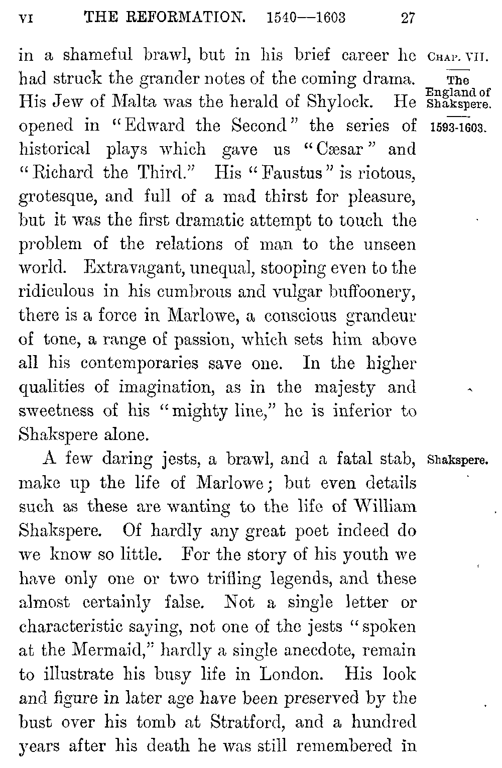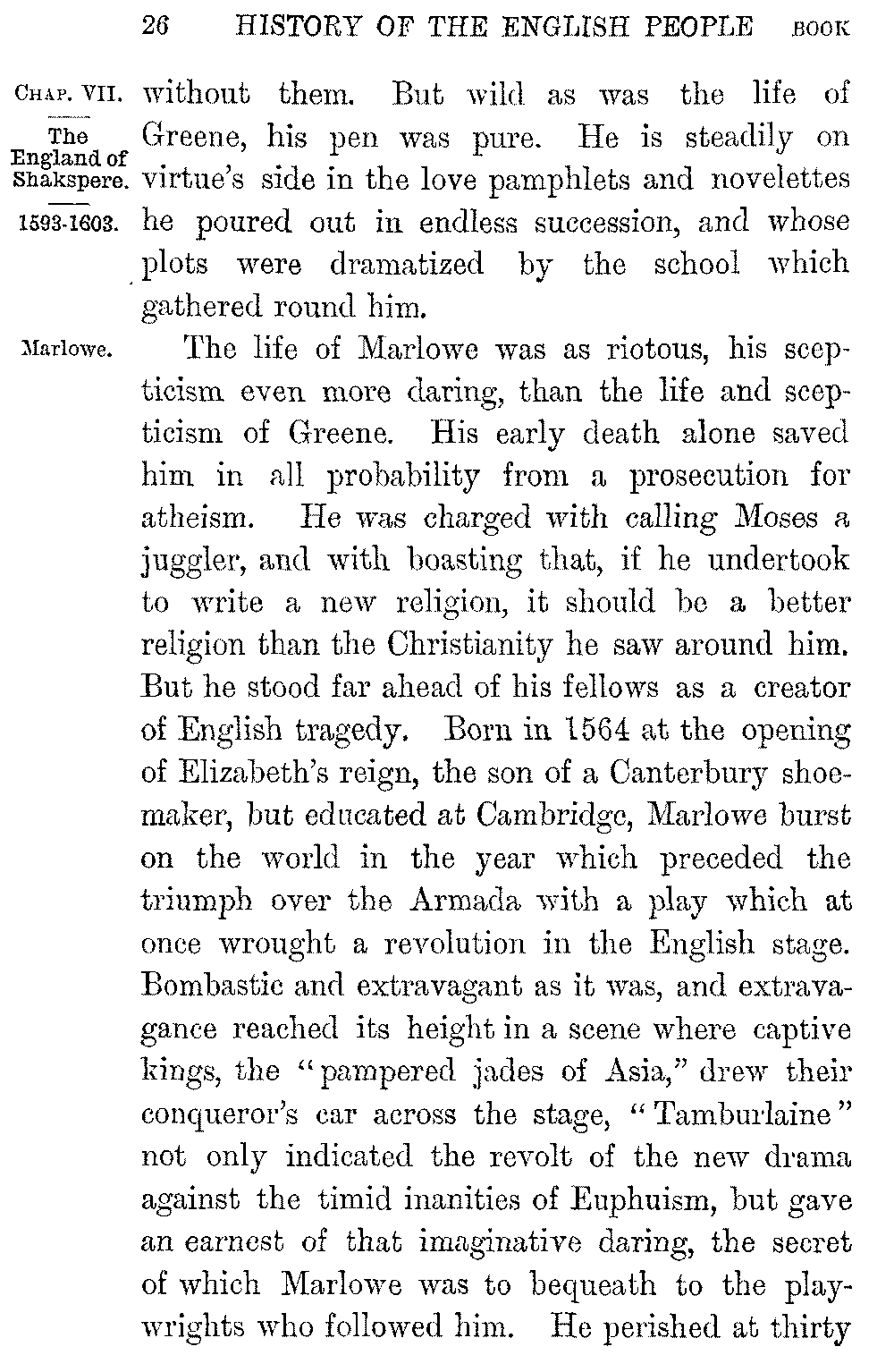 The life of Marlowe was as riotous, his scepticism even more daring, than the life and scepticism of Greene. His early death alone saved him in all probability from a prosecution for atheism. He was charged with calling Moses a juggler, and with boasting that, if he undertook to write a new religion, it should be a better religion than the Christianity he saw around him. But he stood far ahead of his fellows as a creator of English tragedy. Born in 1564 at the opening of Elizabeth's reign, the son of a Canterbury shoemaker, but educated at Cambridge, Marlowe burst on the world in the year which preceded the triumph over the Armada with a play which at once wrought a revolution in the English stage. Bombastic and extravagant as it was, and extravagance reached its height in a scene where captive kings, the "pampered jades of Asia," drew their conqueror's car across the stage, "Tamburlaine" not only indicated the revolt of the new drama against the timid inanities of Euphuism, but gave an earnest of that imaginative daring, the secret of which Marlowe was to bequeath to the playwrights who followed him. He perished at thirty 5-027]in a shameful brawl, but in his brief career he had struck the grander notes of the coming drama. His Jew of Malta was the herald of Shylock. He opened in "Edward the Second" the series of historical plays which gave us "Cæsar" and "Richard the Third." His "Faustus" is riotous, grotesque, and full of a mad thirst for pleasure, but it was the first dramatic attempt to touch the problem of the relations of man to the unseen world. Extravagant, unequal, stooping even to the ridiculous in his cumbrous and vulgar buffoonery, there is a force in Marlowe, a conscious grandeur of tone, a range of passion, which sets him above all his contemporaries save one. In the higher qualities of imagination, as in the majesty and sweetness of his "mighty line," he is inferior to Shakspere alone.