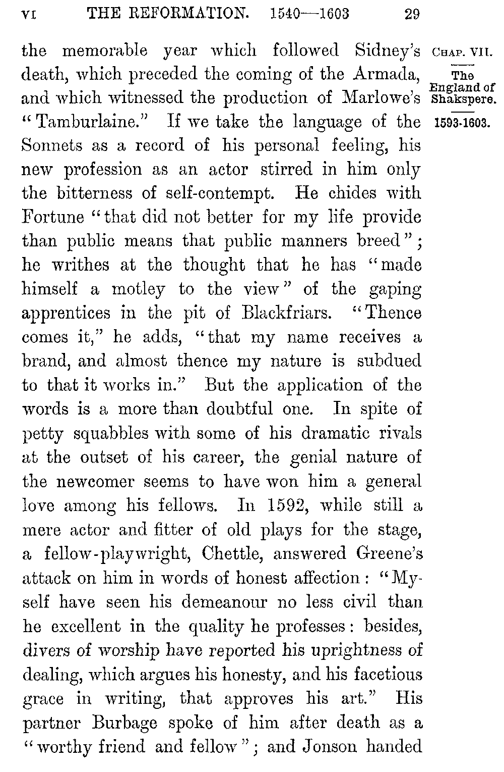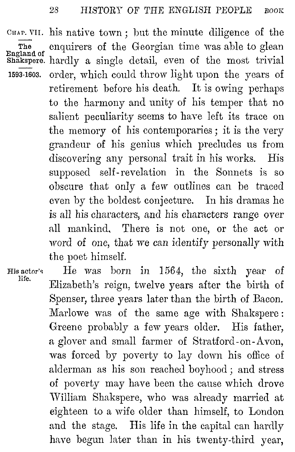 He was born in 1564, the sixth year of Elizabeth's reign, twelve years after the birth of Spenser, three years later than the birth of Bacon. Marlowe was of the same age with Shakspere: Greene probably a few years older. His father, a glover and small farmer of Stratford-on-Avon, was forced by poverty to lay down his office of alderman as his son reached boyhood; and stress of poverty may have been the cause which drove William Shakspere, who was already married at eighteen to a wife older than himself, to London and the stage. His life in the capital can hardly have begun later than in his twenty-third year, 5-029]the memorable year which followed Sidney's death, which preceded the coming of the Armada, and which witnessed the production of Marlowe's "Tamburlaine." If we take the language of the Sonnets as a record of his personal feeling, his new profession as an actor stirred in him only the bitterness of self-contempt. He chides with Fortune "that did not better for my life provide than public means that public manners breed"; he writhes at the thought that he has "made himself a motley to the view" of the gaping apprentices in the pit of Blackfriars. "Thence comes it," he adds, "that my name receives a brand, and almost thence my nature is subdued to that it works in." But the application of the words is a more than doubtful one. In spite of petty squabbles with some of his dramatic rivals at the outset of his career, the genial nature of the newcomer seems to have won him a general love among his fellows. In 1592, while still a mere actor and fitter of old plays for the stage, a fellow-playwright, Chettle, answered Greene's attack on him in words of honest affection: "Myself have seen his demeanour no less civil than he excellent in the quality he professes: besides, divers of worship have reported his uprightness of dealing, which argues his honesty, and his facetious grace in writing, that approves his art." His partner Burbage spoke of him after death as a "worthy friend and fellow"; and Jonson handed 5-030]down the general tradition of his time when he described him as "indeed honest, and of an open and free nature."