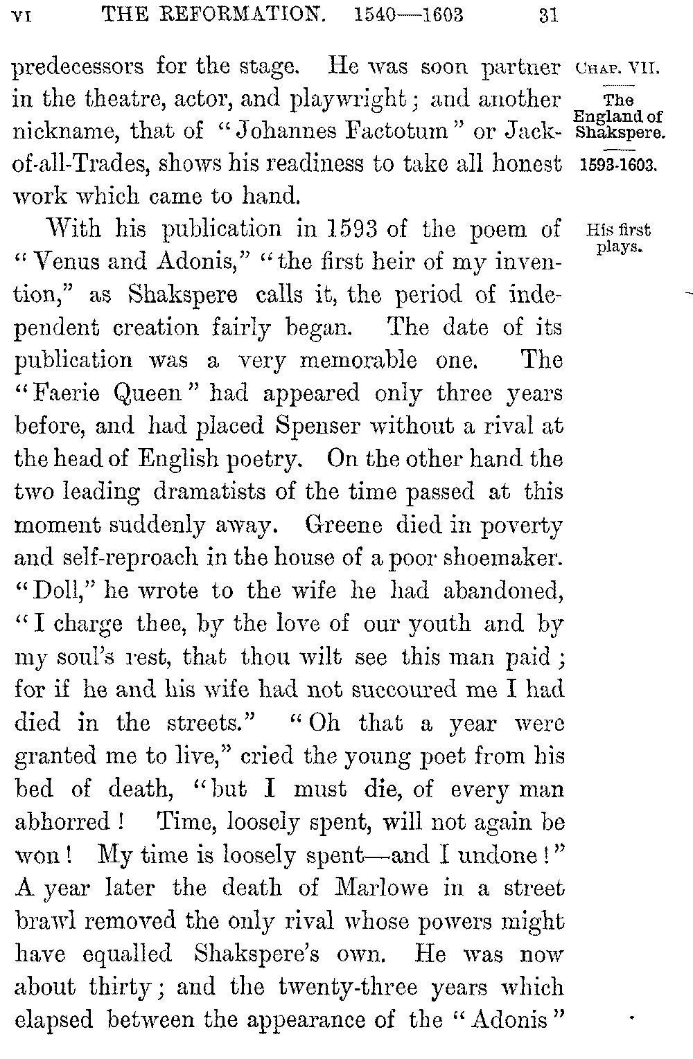 With his publication in 1593 of the poem of "Venus and Adonis," "the first heir of my invention," as Shakspere calls it, the period of independent creation fairly began. The date of its publication was a very memorable one. The "Faerie Queen" had appeared only three years before, and had placed Spenser without a rival at the head of English poetry. On the other hand the two leading dramatists of the time passed at this moment suddenly away. Greene died in poverty and self-reproach in the house of a poor shoemaker. "Doll," he wrote to the wife he had abandoned, "I charge thee, by the love of our youth and by my soul's rest, that thou wilt see this man paid; for if he and his wife had not succoured me I had died in the streets." "Oh that a year were granted me to live," cried the young poet from his bed of death, "but I must die, of every man abhorred! Time, loosely spent, will not again be won! My time is loosely spent—and I undone!" A year later the death of Marlowe in a street brawl removed the only rival whose powers might have equalled Shakspere's own. He was now about thirty; and the twenty-three years which elapsed between the appearance of the "Adonis" 5-032]and his death were filled with a series of masterpieces. Nothing is more characteristic of his genius than its incessant activity. Through the five years which followed the publication of his early poem he seems to have produced on an average two dramas a year. When we attempt however to trace the growth and progress of the poet's mind in the order of his plays we are met in the case of many of them by an absence of certain information as to the dates of their appearance. The facts on which enquiry has to build are extremely few. "Venus and Adonis," with the "Lucrece," must have been written before their publication in 1593-4; the Sonnets, though not published till 1609, were known in some form among his private friends as early as 1598. His earlier plays are defined by a list given in the "Wit's Treasury" of Francis Meres in 1598, though the omission of a play from a casual catalogue of this kind would hardly warrant us in assuming its necessary non-existence at the time. The works ascribed to him at his death are fixed in the same approximate fashion through the edition published by his fellow-actors. Beyond these meagre facts and our knowledge of the publication of a few of his dramas in his lifetime all is uncertain; and the conclusions which have been drawn from these, and from the dramas themselves, as well as from assumed resemblances with, or references to, other plays of the period, 5-033]can only be accepted as approximations to the truth.