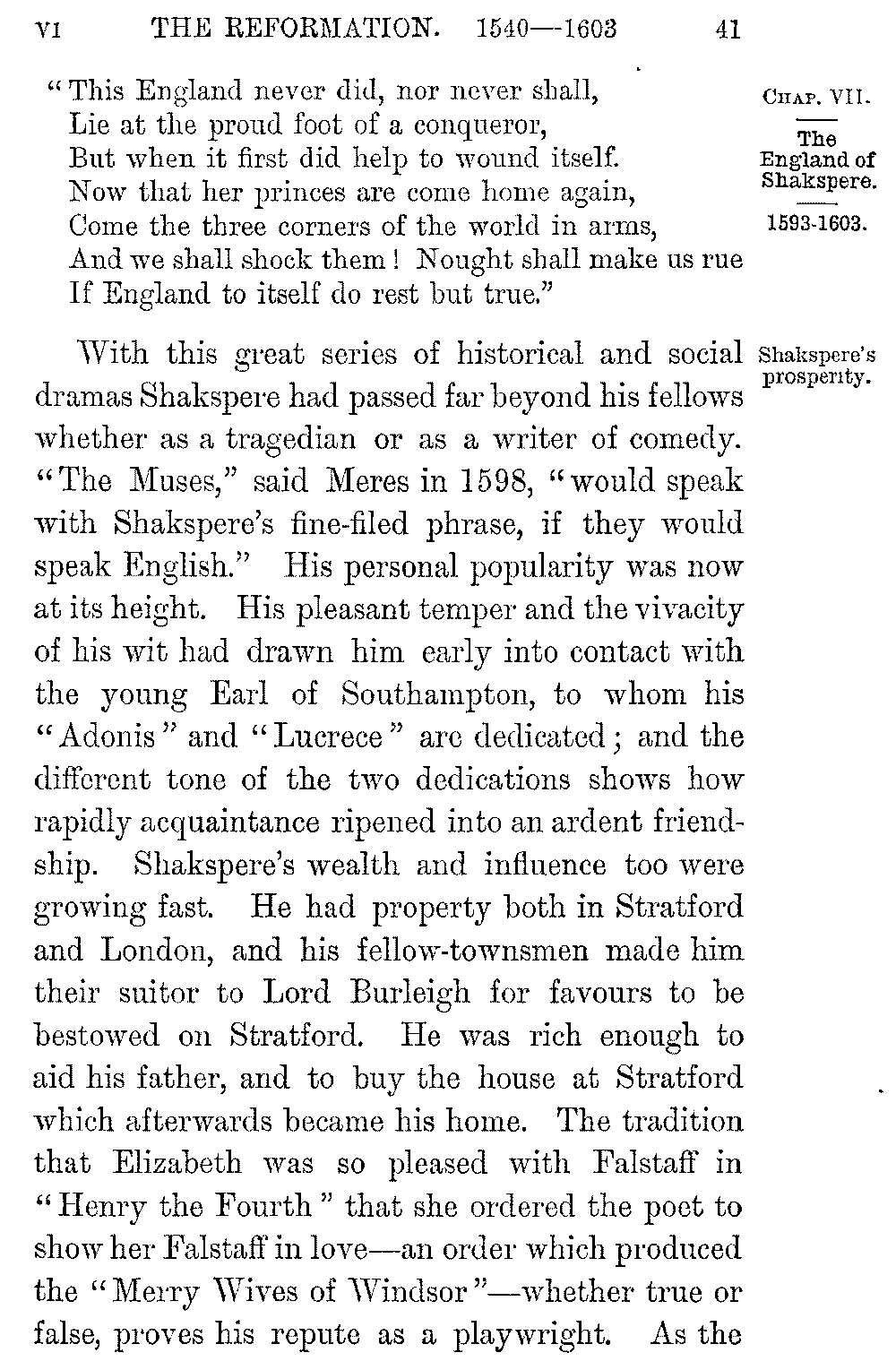 With this great series of historical and social dramas Shakspere had passed far beyond his fellows whether as a tragedian or as a writer of comedy. "The Muses," said Meres in 1598, "would speak with Shakspere's fine-filed phrase, if they would speak English." His personal popularity was now at its height. His pleasant temper and the vivacity of his wit had drawn him early into contact with the young Earl of Southampton, to whom his "Adonis" and "Lucrece" are dedicated; and the different tone of the two dedications shows how rapidly acquaintance ripened into an ardent friendship. Shakspere's wealth and influence too were growing fast. He had property both in Stratford and London, and his fellow-townsmen made him their suitor to Lord Burleigh for favours to be bestowed on Stratford. He was rich enough to aid his father, and to buy the house at Stratford which afterwards became his home. The tradition that Elizabeth was so pleased with Falstaff in "Henry the Fourth" that she ordered the poet to show her Falstaff in love—an order which produced the "Merry Wives of Windsor"—whether true or false, proves his repute as a playwright. As the 5-042]group of earlier poets passed away, they found successors in Marston, Dekker, Middleton, Heywood, and Chapman, and above all in Ben Jonson. But none of these could dispute the supremacy of Shakspere. The verdict of Meres that "Shakspere among the English is the most excellent in both kinds for the stage," represented the general feeling of his contemporaries. He was at last fully master of the resources of his art. The "Merchant of Venice" marks the perfection of his developement as a dramatist in the completeness of its stage effect, the ingenuity of its incidents, the ease of its movement, the beauty of its higher passages, the reserve and self-control with which its poetry is used, the conception and unfolding of character, and above all the mastery with which character and event are grouped round the figure of Shylock. Master as he is of his art, the poet's temper is still young; the "Merry Wives of Windsor" is a burst of gay laughter; and laughter more tempered, yet full of a sweeter fascination, rings round us in "As You Like It."