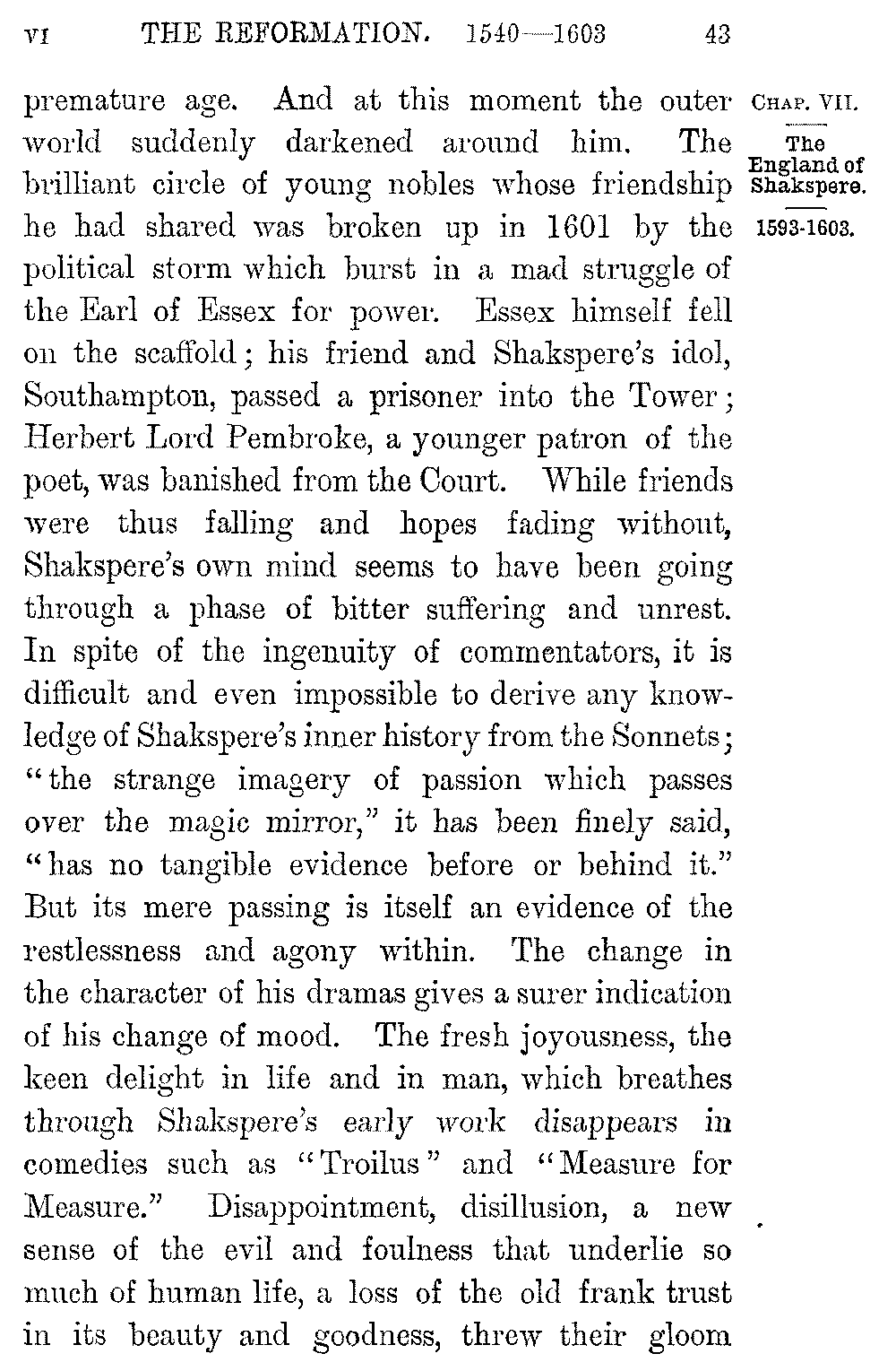 But in the melancholy and meditative Jaques of the last drama we feel the touch of a new and graver mood. Youth, so full and buoyant in the poet till now, seems to have passed almost suddenly away. Though Shakspere had hardly reached forty, in one of his Sonnets which cannot have been written at a much later time than this there are indications that he already felt the advance of 5-043]premature age. And at this moment the outer world suddenly darkened around him. The brilliant circle of young nobles whose friendship he had shared was broken up in 1601 by the political storm which burst in a mad struggle of the Earl of Essex for power. Essex himself fell on the scaffold; his friend and Shakspere's idol, Southampton, passed a prisoner into the Tower; Herbert Lord Pembroke, a younger patron of the poet, was banished from the Court. While friends were thus falling and hopes fading without, Shakspere's own mind seems to have been going through a phase of bitter suffering and unrest. In spite of the ingenuity of commentators, it is difficult and even impossible to derive any knowledge of Shakspere's inner history from the Sonnets; "the strange imagery of passion which passes over the magic mirror," it has been finely said, "has no tangible evidence before or behind it." But its mere passing is itself an evidence of the restlessness and agony within. The change in the character of his dramas gives a surer indication of his change of mood. The fresh joyousness, the keen delight in life and in man, which breathes through Shakspere's early work disappears in comedies such as "Troilus" and "Measure for Measure." Disappointment, disillusion, a new sense of the evil and foulness that underlie so much of human life, a loss of the old frank trust in its beauty and goodness, threw their gloom 5-044]over these comedies. Failure seems everywhere. In "Julius Cæsar" the virtue of Brutus is foiled by its ignorance of and isolation from mankind; in Hamlet even penetrating intellect proves helpless for want of the capacity of action; the poison of Iago taints the love of Desdemona and the grandeur of Othello; Lear's mighty passion battles helplessly against the wind and the rain; a woman's weakness of frame dashes the cup of her triumph from the hand of Lady Macbeth; lust and self-indulgence blast the heroism of Antony; pride ruins the nobleness of Coriolanus.