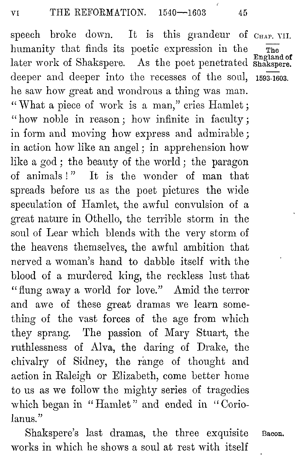 But the very struggle and self-introspection that these dramas betray were to give a depth and grandeur to Shakspere's work such as it had never known before. The age was one in which man's temper and powers took a new range and energy. Sidney or Raleigh lived not one but a dozen lives at once; the daring of the adventurer, the philosophy of the scholar, the passion of the lover, the fanaticism of the saint, towered into almost superhuman grandeur. Man became conscious of the immense resources that lay within him, conscious of boundless powers that seemed to mock the narrow world in which they moved. All through the age of the Renascence one feels this impress of the gigantic, this giant-like activity, this immense ambition and desire. The very bombast and extravagance of the times reveal cravings and impulses before which common 5-045]speech broke down. It is this grandeur of humanity that finds its poetic expression in the later work of Shakspere. As the poet penetrated deeper and deeper into the recesses of the soul, he saw how great and wondrous a thing was man. "What a piece of work is a man," cries Hamlet; "how noble in reason; how infinite in faculty; in form and moving how express and admirable; in action how like an angel; in apprehension how like a god; the beauty of the world; the paragon of animals!" It is the wonder of man that spreads before us as the poet pictures the wide speculation of Hamlet, the awful convulsion of a great nature in Othello, the terrible storm in the soul of Lear which blends with the very storm of the heavens themselves, the awful ambition that nerved a woman's hand to dabble itself with the blood of a murdered king, the reckless lust that "flung away a world for love." Amid the terror and awe of these great dramas we learn something of the vast forces of the age from which they sprang. The passion of Mary Stuart, the ruthlessness of Alva, the daring of Drake, the chivalry of Sidney, the range of thought and action in Raleigh or Elizabeth, come better home to us as we follow the mighty series of tragedies which began in "Hamlet" and ended in "Coriolanus."