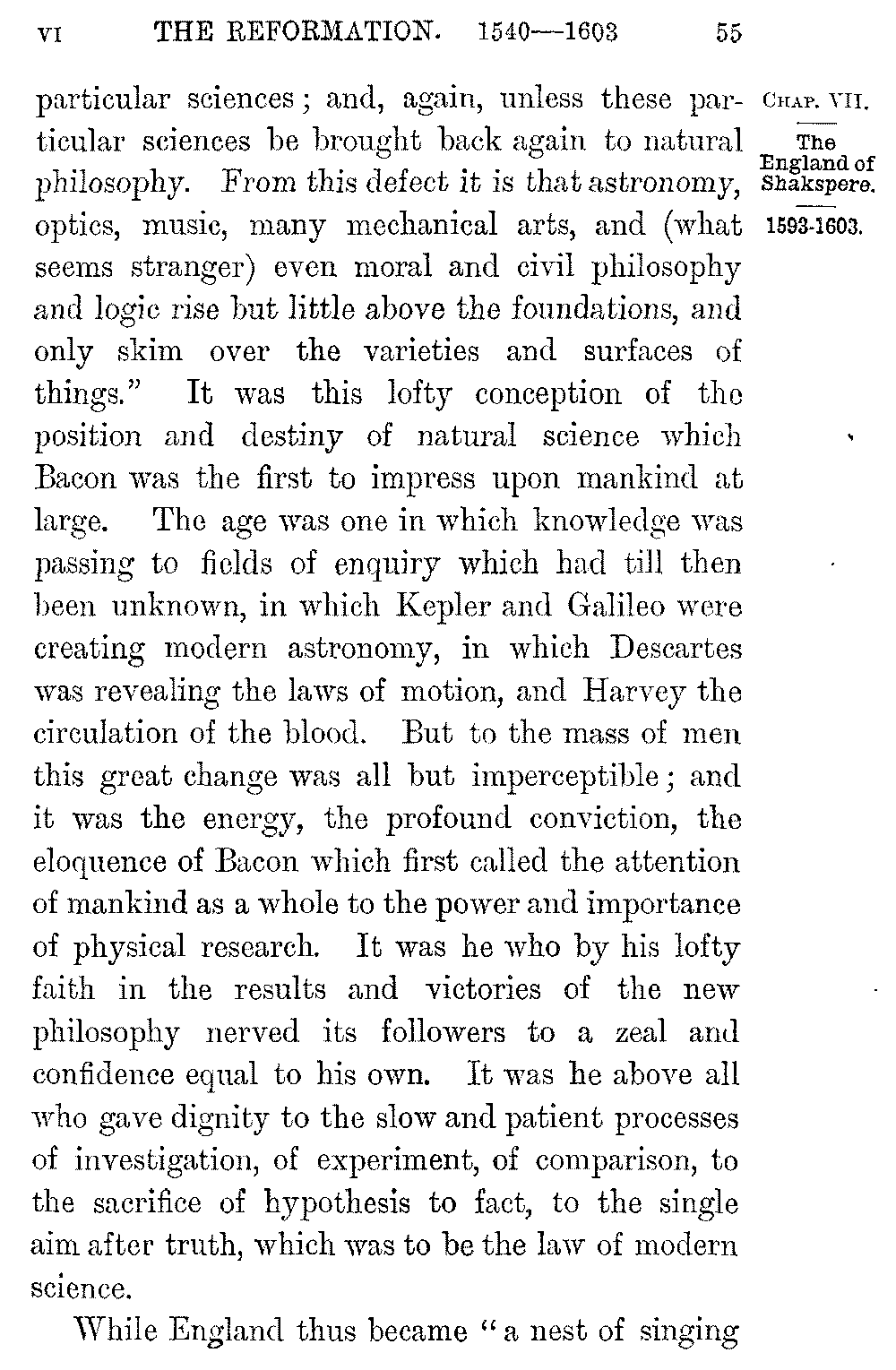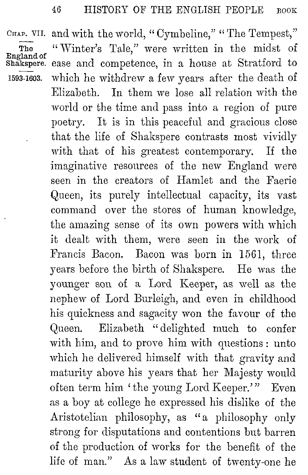 Shakspere's last dramas, the three exquisite works in which he shows a soul at rest with itself 5-046]and with the world, "Cymbeline," "The Tempest," "Winter's Tale," were written in the midst of ease and competence, in a house at Stratford to which he withdrew a few years after the death of Elizabeth. In them we lose all relation with the world or the time and pass into a region of pure poetry. It is in this peaceful and gracious close that the life of Shakspere contrasts most vividly with that of his greatest contemporary. If the imaginative resources of the new England were seen in the creators of Hamlet and the Faerie Queen, its purely intellectual capacity, its vast command over the stores of human knowledge, the amazing sense of its own powers with which it dealt with them, were seen in the work of Francis Bacon. Bacon was born in 1561, three years before the birth of Shakspere. He was the younger son of a Lord Keeper, as well as the nephew of Lord Burleigh, and even in childhood his quickness and sagacity won the favour of the Queen. Elizabeth "delighted much to confer with him, and to prove him with questions: unto which he delivered himself with that gravity and maturity above his years that her Majesty would often term him 'the young Lord Keeper.'" Even as a boy at college he expressed his dislike of the Aristotelian philosophy, as "a philosophy only strong for disputations and contentions but barren of the production of works for the benefit of the life of man." As a law student of twenty-one he 5-047]sketched in a tract on the "Greatest Birth of Time" the system of inductive enquiry which he was already prepared to substitute for it. The speculations of the young thinker however were interrupted by his hopes of Court success. But these were soon dashed to the ground. He was left poor by his father's death; the ill-will of the Cecils barred his advancement with the Queen: and a few years before Shakspere's arrival in London Bacon entered as a barrister at Gray's Inn. He soon became one of the most successful lawyers of the time. At twenty-three Bacon was a member of the House of Commons, and his judgement and eloquence at once brought him to the front. "The fear of every man that heard him was lest he should make an end," Ben Jonson tells us. The steady growth of his reputation was quickened in 1597 by the appearance of his "Essays," a work remarkable, not merely for the condensation of its thought and its felicity and exactness of expression, but for the power with which it applied to human life that experimental analysis which Bacon was at a later time to make the key of Science.
