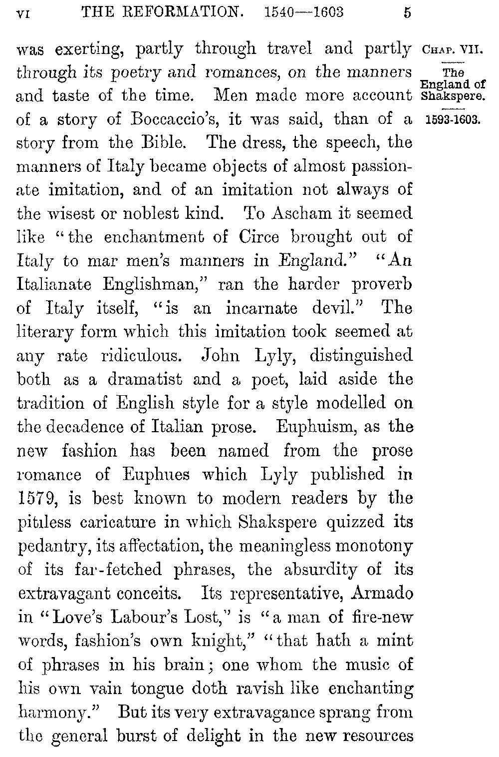 A far higher developement of our literature sprang from the growing influence which Italy 5-005]was exerting, partly through travel and partly through its poetry and romances, on the manners and taste of the time. Men made more account of a story of Boccaccio's, it was said, than of a story from the Bible. The dress, the speech, the manners of Italy became objects of almost passionate imitation, and of an imitation not always of the wisest or noblest kind. To Ascham it seemed like "the enchantment of Circe brought out of Italy to mar men's manners in England." "An Italianate Englishman," ran the harder proverb of Italy itself, "is an incarnate devil." The literary form which this imitation took seemed at any rate ridiculous. John Lyly, distinguished both as a dramatist and a poet, laid aside the tradition of English style for a style modelled on the decadence of Italian prose. Euphuism, as the new fashion has been named from the prose romance of Euphues which Lyly published in 1579, is best known to modern readers by the pitiless caricature in which Shakspere quizzed its pedantry, its affectation, the meaningless monotony of its far-fetched phrases, the absurdity of its extravagant conceits. Its representative, Armado in "Love's Labour's Lost," is "a man of fire-new words, fashion's own knight," "that hath a mint of phrases in his brain; one whom the music of his own vain tongue doth ravish like enchanting harmony." But its very extravagance sprang from the general burst of delight in the new resources 5-006]of thought and language which literature felt to be at its disposal; and the new sense of literary beauty which it disclosed in its affectation, in its love of a "mint of phrases," and the "music of its own vain tongue," the new sense of pleasure which it revealed in delicacy or grandeur of expression, in the structure and arrangement of sentences, in what has been termed the atmosphere of words, was a sense out of which style was itself to spring.