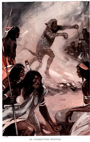 And what a glorious sight it was that met their gaze. First of all there was the green and placid water, alive with fish, rippling gently to a narrow beach of golden sand, and beyond that sand nothing but vegetation, rich, green, and luxuriant. Green! yes, but of a hundred different tints, from the tender hue of the young shoots that was almost yellow, to a deep olive that turned to black in the shadows. If the tints of the vegetation were admirable, no less so were its forms; for there were palms of many different kinds, including the coconut palm in thousands, close down to the water’s edge. The traveller tree, shaped like a fan made of organ pipes; the banana and plantain, loaded with great bunches of fruit, each bunch a fair load for a man; there were great clumps of feathery bamboo; there were big trees covered with scarlet flowers instead of leaves; there was the flaming bougainvillea in profusion; and, in addition, there were great trailing cables of orchids, of weird shapes and vivid colouring reaching from bough to bough. Yes, there was plenty to see and marvel at, and there would be more when those few yards of rippling water had been spanned and their feet pressed the lush grass of yonder flowery mead close by the river’s margin; humming birds, the plumage of which shone in the sun like burnished gold and glowing gems, butterflies as big as sparrows, with wings painted in hues so gorgeous that the painter who should attempt to reproduce them would be driven to despair, enormous dragon-flies flitting hither and thither over the still surface of the river, kingfishers as big as parrots, monkeys in hundreds, agoutis, and, alas!—to strengthen its resemblance to that other Eden—serpents as well, contact with which meant death.