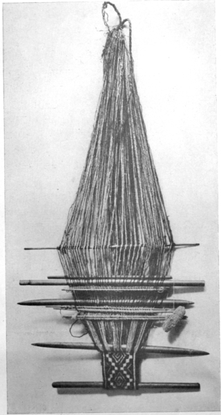 Wonderful as is the development of modern machinery for the manufacture of American textiles—machinery which seems almost human in the way it converts raw materials into finished cloth; just as surprising are the most primitive looms of the American aborigines, who without the aid of machinery make interesting weavings with only a bar upon which to suspend the warp threads while the human hand completes all the processes of manufacture. Modern man's inventive genius in the textile art has been expended upon perfecting the machinery, while primitive man's ingenuity has resulted in making a beautiful weaving with very simple means.