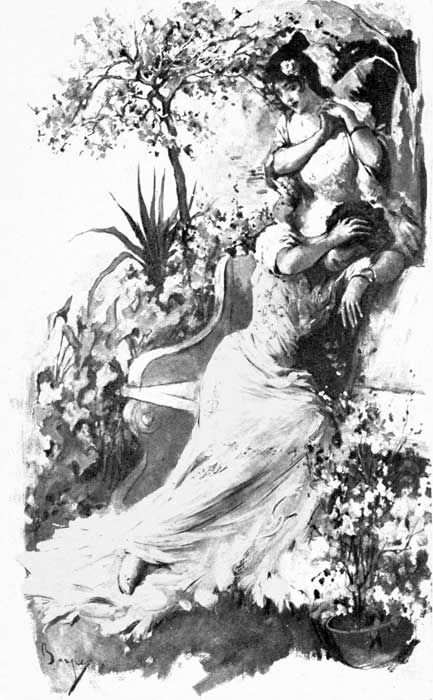 Above them shone the stars, golden as the apples of Hesperides. He heard again the rhythmic sound of the sea and the plashing of the fountain near at hand, and noted the rose petals which the breeze had shaken from the bushes to the path where they stood; filling the[Pg 25] soft night air with their fragrance, and she, with the white moonlight in her face and the pink rose in the golden wreath of her hair, fair as the woman of Eden.