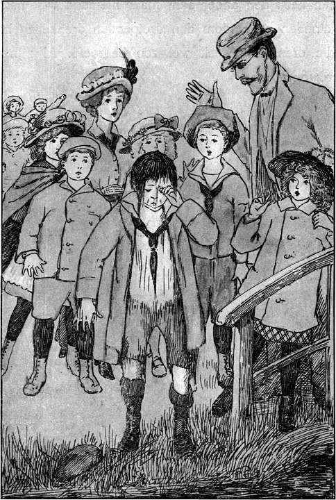 „En nu gaan we naar beneden, hoor! Wel foei, wat heb je me moe gemaakt. Vandaag heb ik nog wel zoo hard moeten werken! Jelui had je arme moeder wat moeten sparen.”