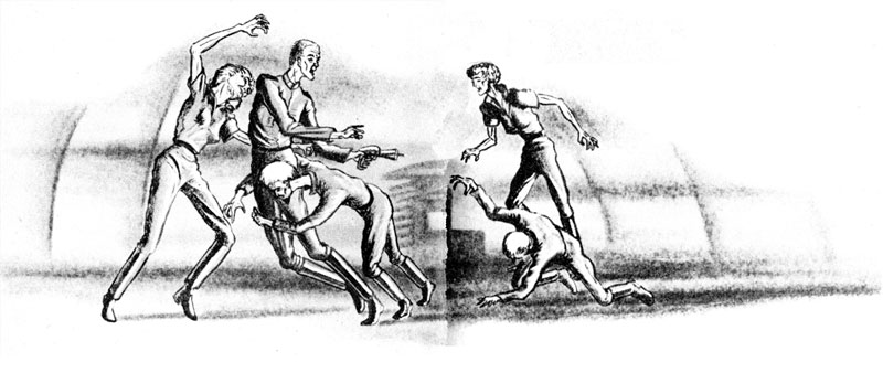 It was decided that their metabolisms must be lowered and that they must live for the most part in their bunks. All activity must be cut to minimum. All weapons must be jettisoned, except one, the captain's shock gun, that could not kill but only cause unconsciousness for twenty-four hours.
