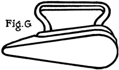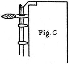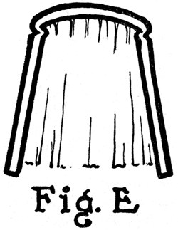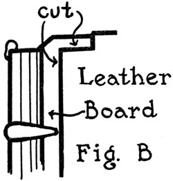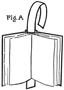 To do this, cut a strip of medium weight Japan vellum—which is the best paper for the purpose—a few inches more than twice the height of the book and in width equal to the inside back. One end of this, with the corners clipped so it will not catch, is inserted between the outside and inside backs of the book and slipped through[Pg 21] until it projects about an inch at the bottom of the book. (Fig. A.) The part of the strip left exposed at the top is then well coated on the inside face with the paste mentioned above and pulled into the book, against the inside back or lining, by means of the end projecting at the bottom. The surplus of the strip at top and bottom is then cut off, two short slips of paper temporarily inserted at top and bottom to prevent the new lining adhering to the outside back, and a firm hand pressure applied all over the back to force the new lining into close union with the old on the backs of the signatures. The book is then set[Pg 22] aside to dry, under a light pressure, after which the two slips of paper inserted at top and bottom are pulled out.