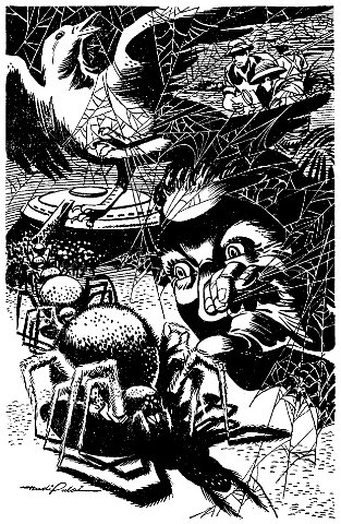 I think the real horror of this thing started to penetrate to me about June 6. Our big spray job lasted less than 24 hours, and on that morning I was watching for the planes to come in for a second try at it when I noticed the heavy spider webbing in the upper tree foliage. As I looked a gull dove through the trees, mouth open, eating Tabbies. Damned if the webs didn't foul his wings. At first he tore at them bravely and it looked like he was trying to swim in thin mud—sort of slow motion. Then he headed into a thick patch, slewed around at right angles and did a complete flip. Instantly three mammoth spiders the size of my fist pounced out on him and trussed him up before he could tear loose with his feet.