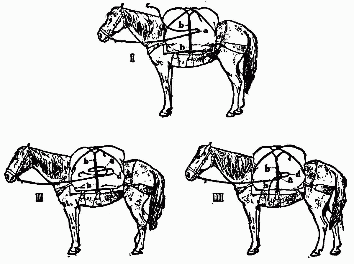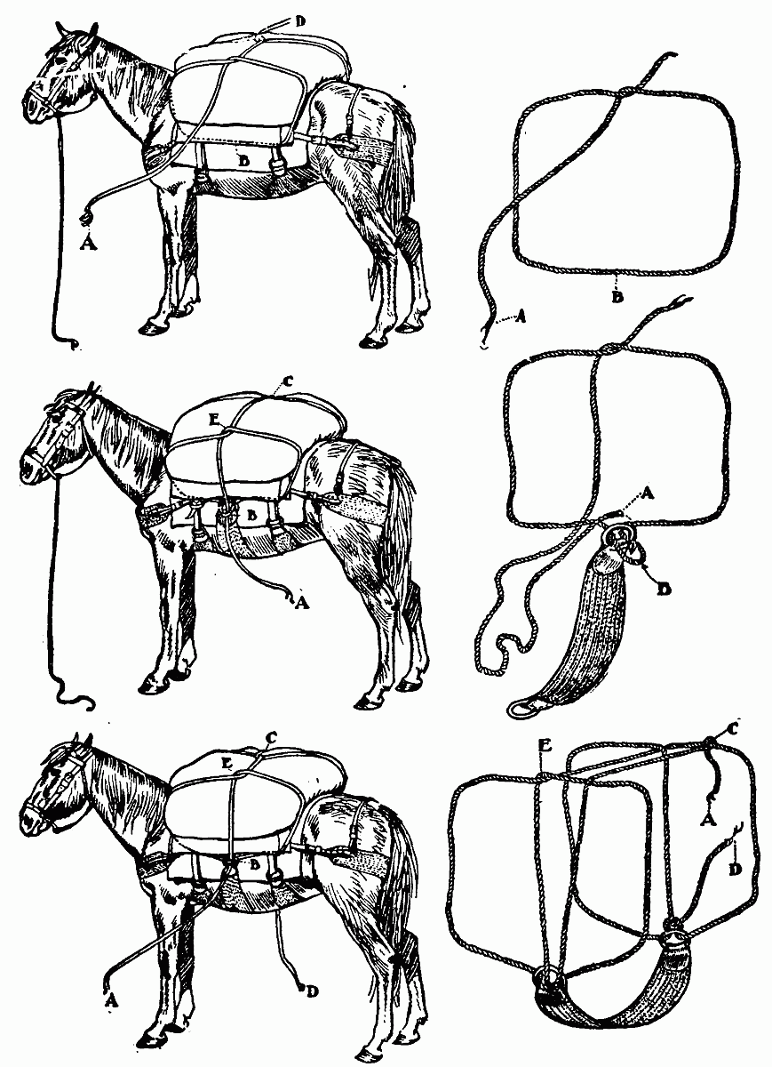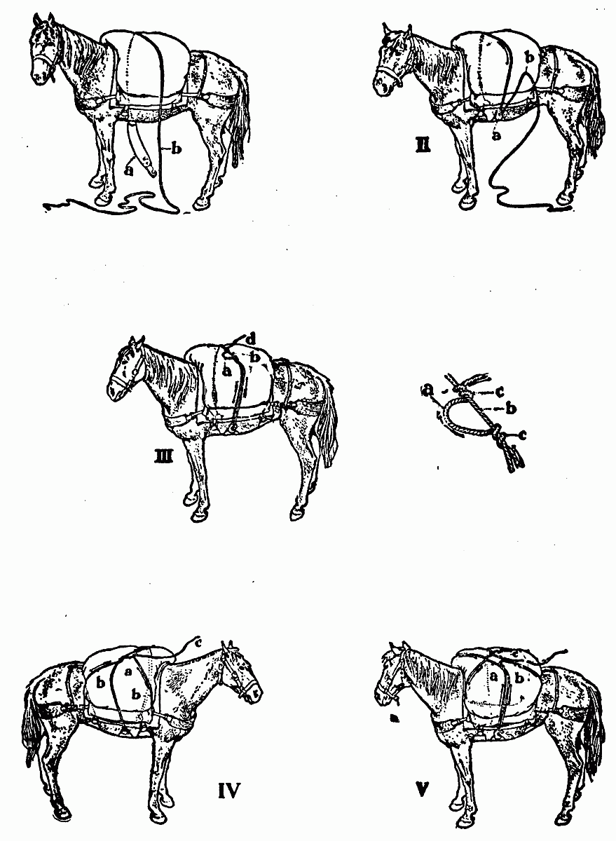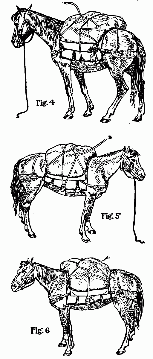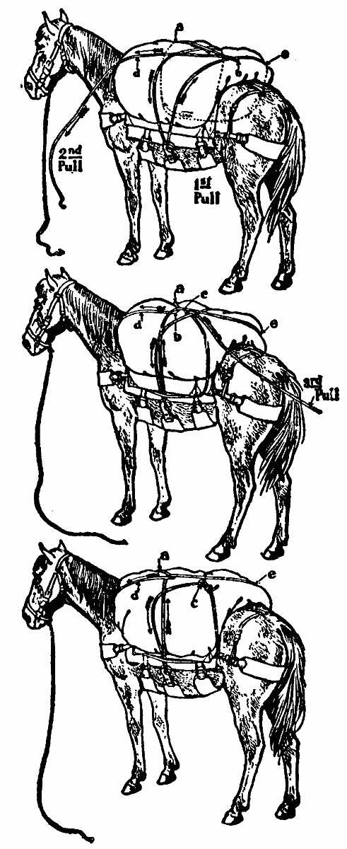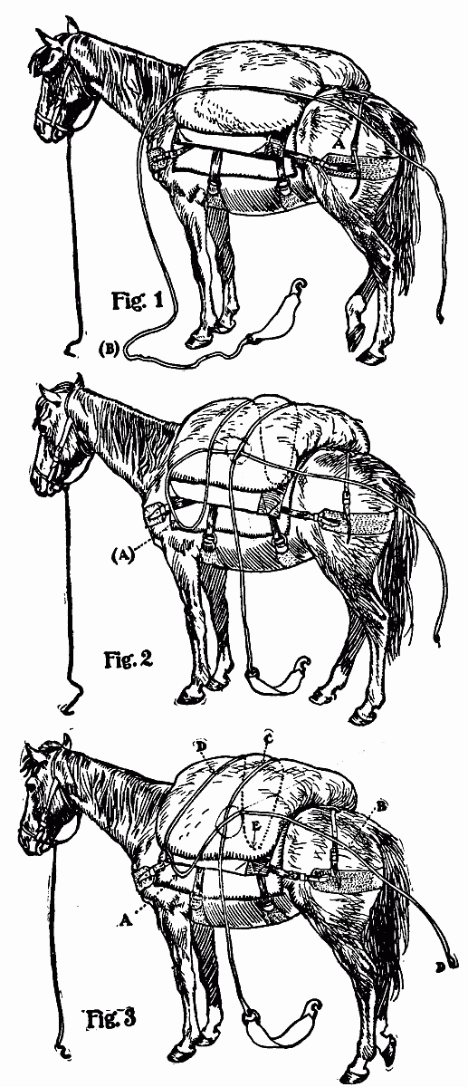 Jones was occupied with a small mule which he claimed was "bad." He hitched said mule to a tree, then proceeded to elevate one hind leg by means of a rope thrown over a limb. Why he did not simply blindfold[16] the animal no one could tell. We looked forward with some joy to the throwing of the pack-hitches.