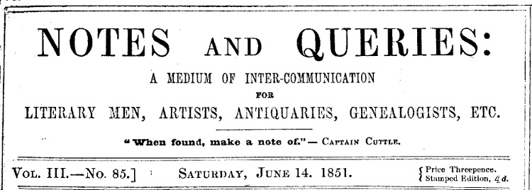 Vol. III.—No. 85. NOTES AND QUERIES: A MEDIUM OF INTER-COMMUNICATION FOR LITERARY MEN, ARTISTS, ANTIQUARIES, GENEALOGISTS, ETC.