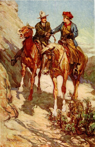 With the indifference of experience and long usage he had been riding carelessly along an old pre-historic trail through the cañon, probably made and forgotten long before the Spaniards spied out the land. Engrossed in his thoughts, he had been heedless alike of the wall above and of the wall below. Prior to that moment neither the over-hanging rock that curved above his head nor the almost sheer fall to the river a thousand feet beneath the narrow ledge of the trail had influenced him at all. He might have[Pg 2] been riding a country road so indifferent had been his progress. That momentary shriek dying thinly away into a strange silence changed everything.
