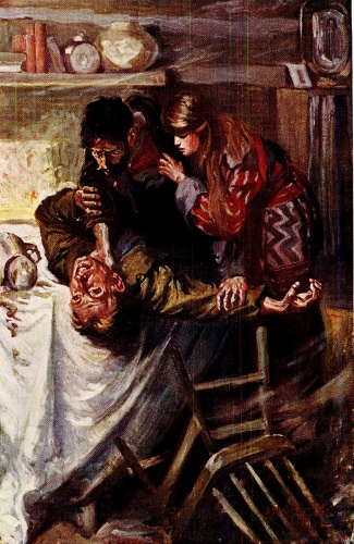No, he could not do it. He laid the weapon down on the rock again and bowed forward on his knees, praying incoherently, protesting that God should place this burden on mere man. In the silence he could hear the awful rasp of her breath—the only answer. He looked up to find her eyes upon him again.