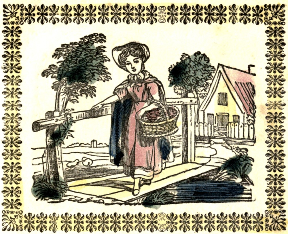 This little girl is the daughter of a poor woman, who lives in the cottage just beyond the bridge over which you see she is passing. In her basket she is carrying some radishes, which she sells to her more wealthy neighbors. They all know her; and though poor, she is respected and treated kindly by them. She has improved very much at school, though she cannot attend as regularly as those who do not have to work for a living.