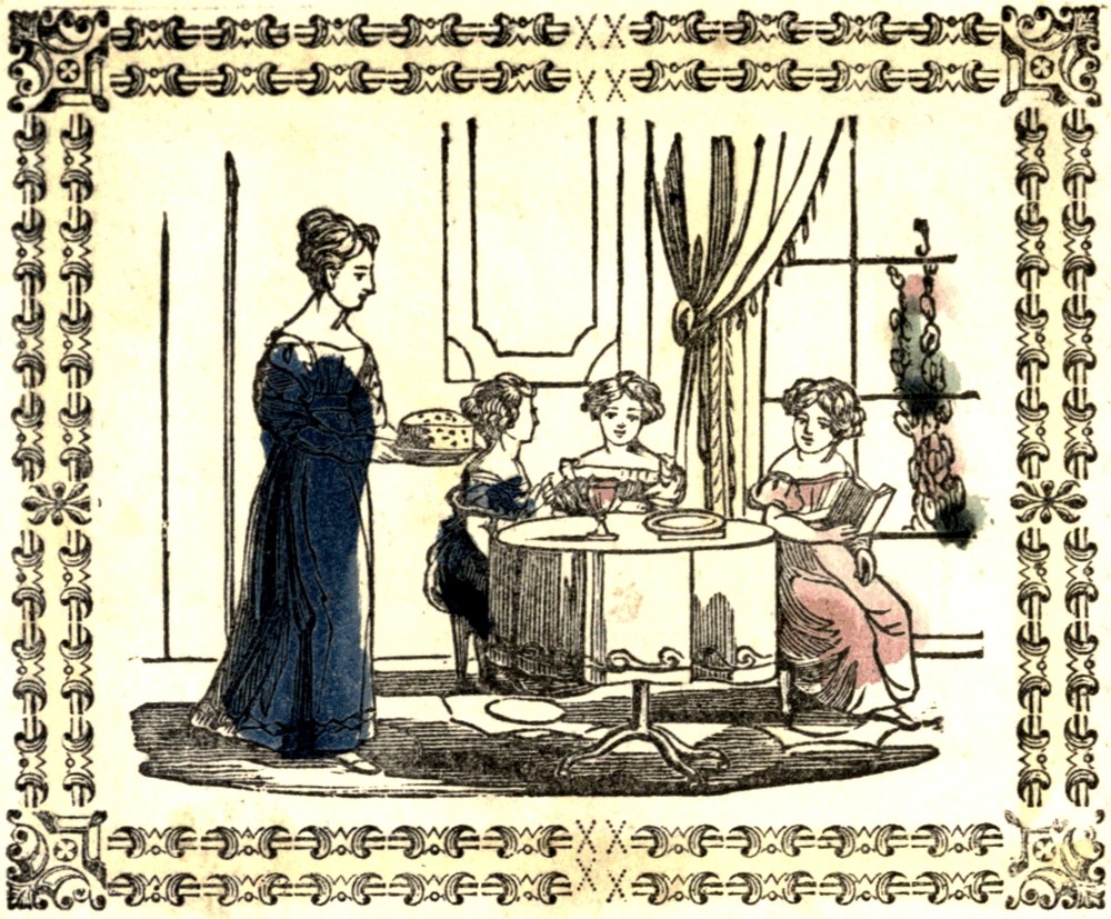 Ellen Carter was a good girl. She always loved to obey her mamma. Unlike many naughty children, she did not stop to inquire whether it would be agreeable to herself; but did what she was bid cheerfully and promptly. For this reason, her mamma loved her. One fine afternoon, she permitted her to receive a visit from two of her schoolmates, whom you see with her, regaling themselves at the table. They behave so prettily that I cannot think they will indulge themselves with eating to excess.